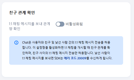 활성화: 1:1 채팅 시작 전 친구 관계를 확인합니다. 친구 간의 1:1 메시지 발송만 허용되며, 낯선 사람이 1:1 메시지를 보내면 SDK는 에러 코드 20009를 수신하게 됩니다. 비활성화: 1:1 채팅을 시작할 때 친구 관계를 확인하지 않고, 친구 및 낯선 사람 간의 1:1 메시지 발송을 허용합니다. 이는 기본 설정 값입니다.