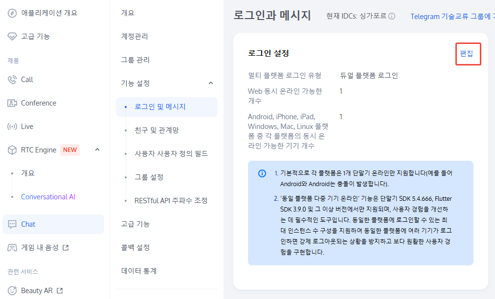 IM 콘솔에 로그인하여 대상 애플리케이션 카드를 클릭하고 왼쪽 사이드바에서 기능 설정>로그인 및 메시지를 선택하여 비즈니스 니즈에 따라 로그인 및 메시지 관련 설정을 관리할 수 있습니다. 로그인 설정