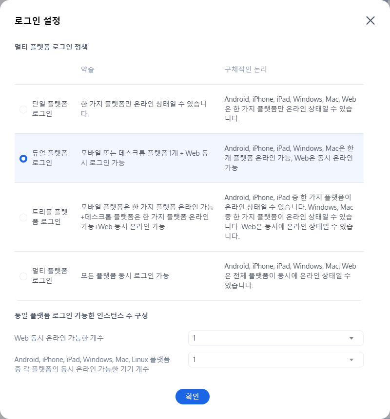 2. 로그인 설정 팝업 창에서 멀티 플랫폼 로그인 유형을 선택하고, Web 및 기타 플랫폼의 동시 온라인 인스턴스 수를 설정합니다.