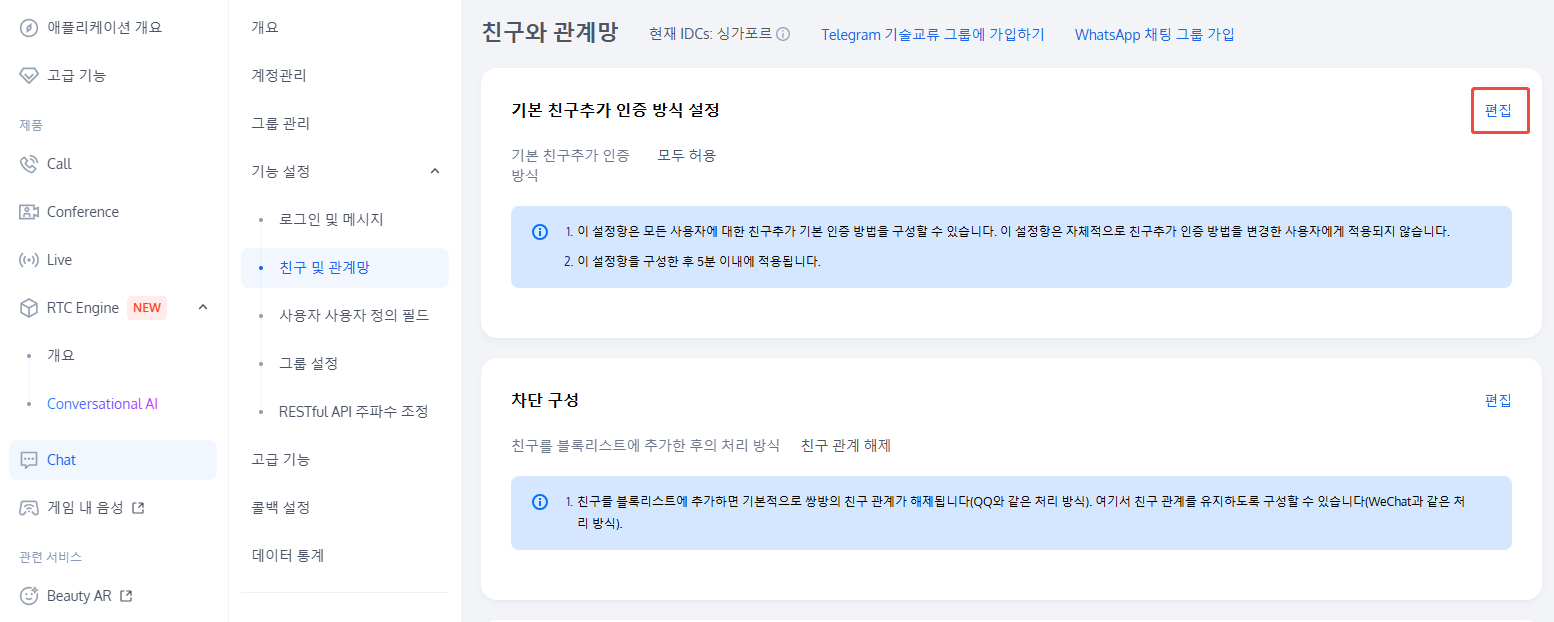 1. Chat 콘솔에 로그인한 후 대상 애플리케이션 카드를 클릭합니다. 2. 왼쪽 사이드바에서 기능 설정>친구 및 관계망을 선택하고, 기본 친구 추가 인증 방법 설정의 기능 카드 우측의 편집을 클릭합니다.