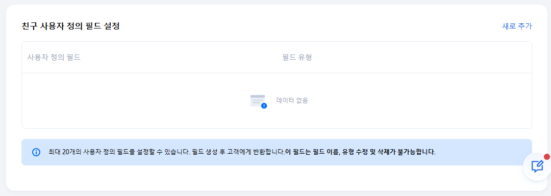3. 친구 사용자 정의 필드 기능 카드 우측의 추가를 클릭합니다.