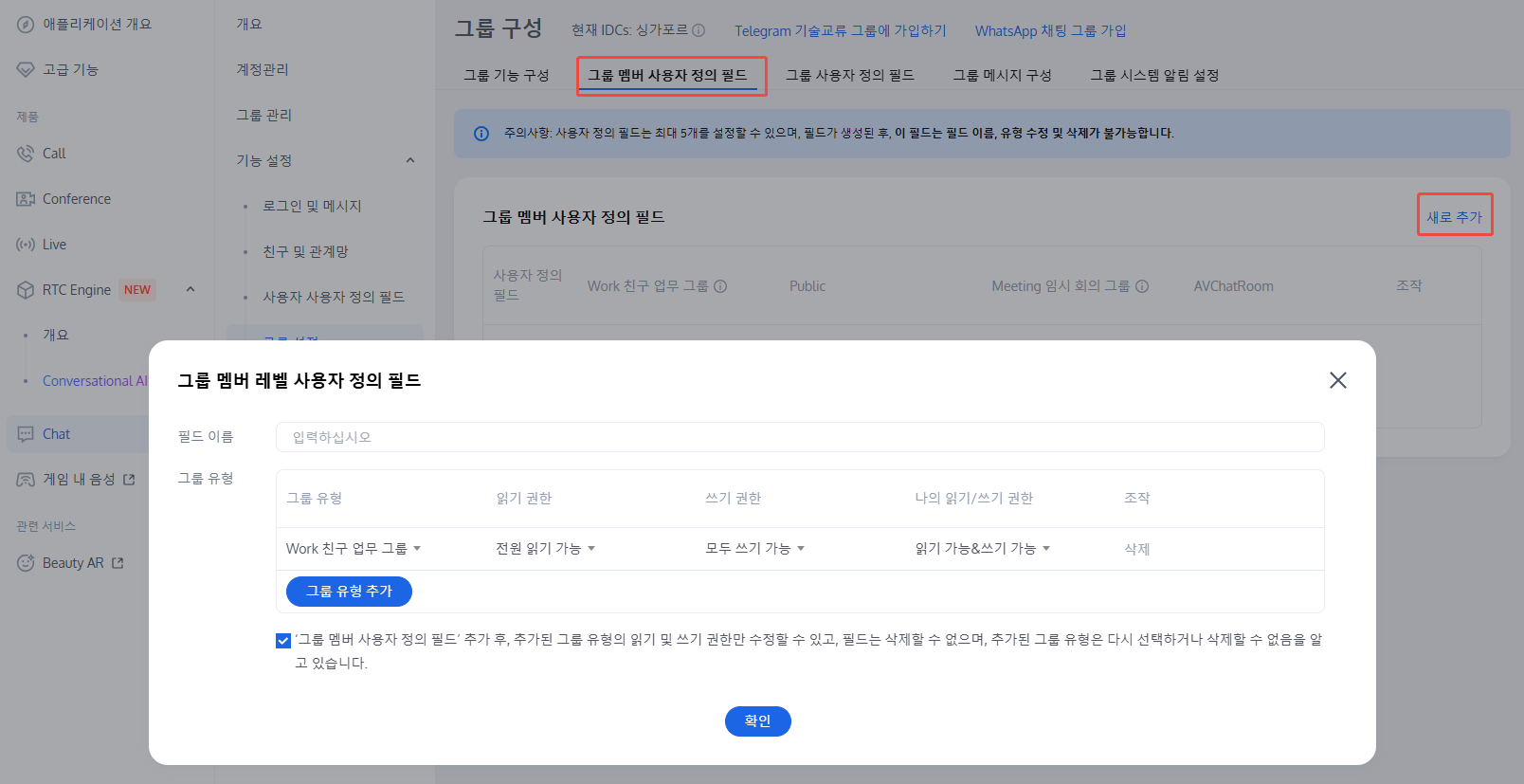 Chat 콘솔에 로그인하여 대상 애플리케이션 카드를 클릭하고 왼쪽 사이드바에서 기능 설정>그룹 사용자 정의 필드를 선택하여 비즈니스 니즈에 따라 그룹 사용자 정의 필드를 관리할 수 있습니다. 주의: