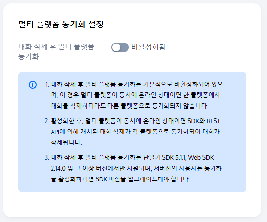 활성화: 여러 단말이 동시에 온라인 상태일 경우, 삭제된 대화가 각 단말에 동기화되고, 대화가 동시 삭제됩니다.