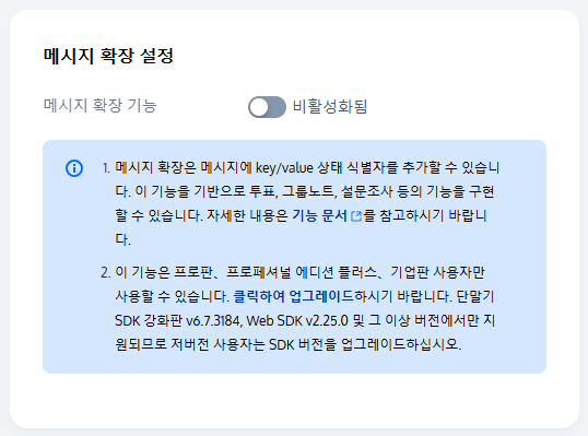 메시지 확장을 사용하면 메시지에 대한 key/value을 구성하여 투표, 그룹 노트 및 설문 조사와 같은 기능을 구현할 수 있습니다. 자세한 내용은 여기를 참고하십시오. 메시지 확장은 플래그십 에디션 사용자만 사용할 수 있으며 기본 SDK 인핸스드 에디션 v6.7.3184 이상에서만 지원됩니다. 이전 버전을 사용하는 경우 SDK를 업그레이드하십시오. 전체 푸시 설정
