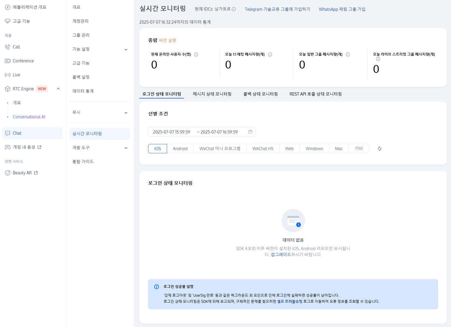 현재 SDK 버전 4.8.10 이상이 설치된 iOS, Android, Windows 및 Mac 장치에서 보고된 로그인 데이터만 표시할 수 있습니다. 최신 SDK 사용을 권장합니다. Web 단말은 현재 채팅 유형별 메시지 수 통계가 지원되지 않습니다. 콜백 상황 모니터링 섹션에서는 콜백 횟수와 성공률을 확인할 수 있습니다.