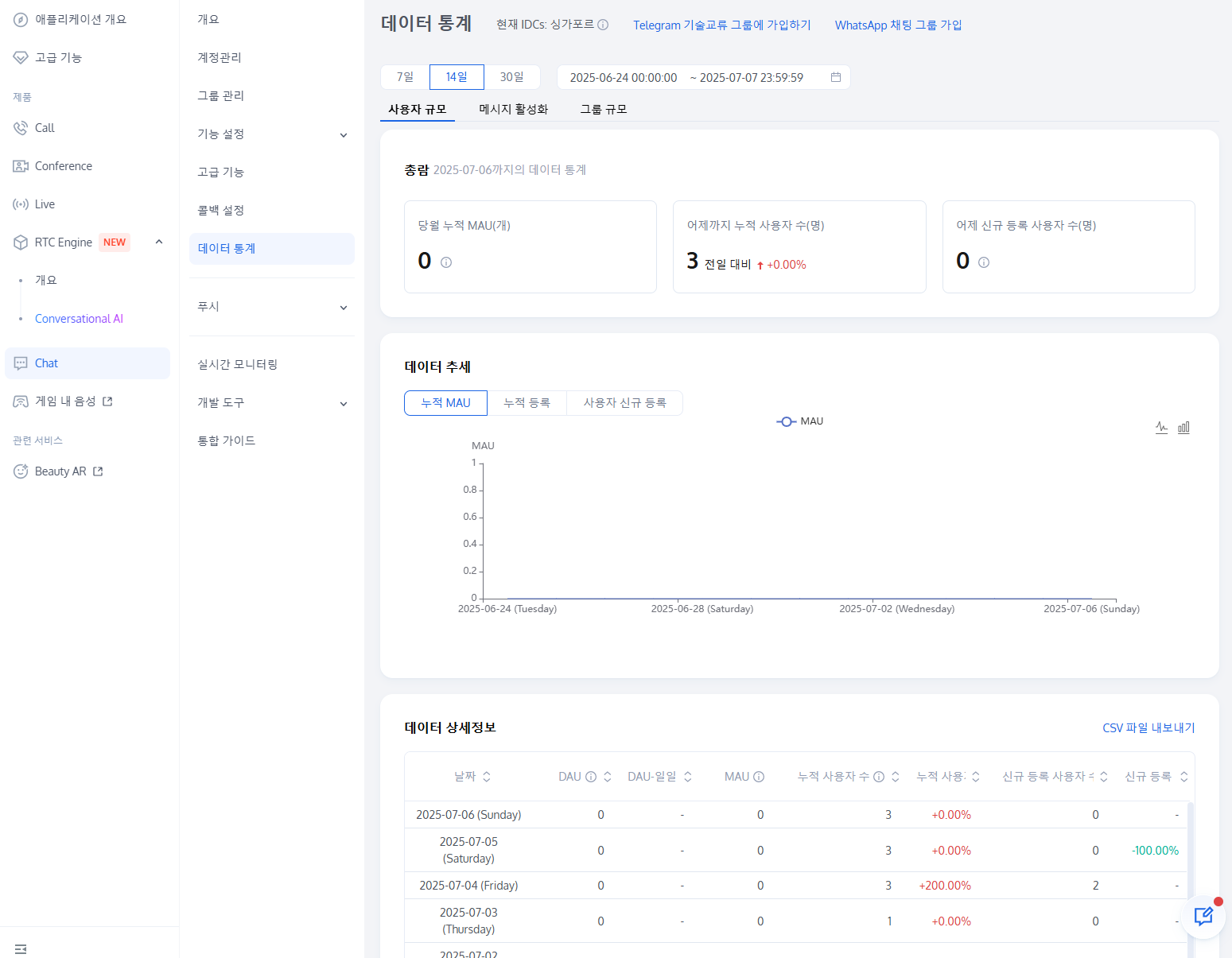 5. 데이터 세부 정보 영역에서 DAU, DAU-일일 대비, 누적 사용자 수, 누적 사용자 수-일일 대비, 신규 등록 사용자 수, 신규 등록 사용자 수-일일 대비 등 선택한 기간 동안의 일별 데이터를 볼 수 있습니다. CSV로 내보내기를 클릭하여 이러한 데이터를 내보낼 수도 있습니다.