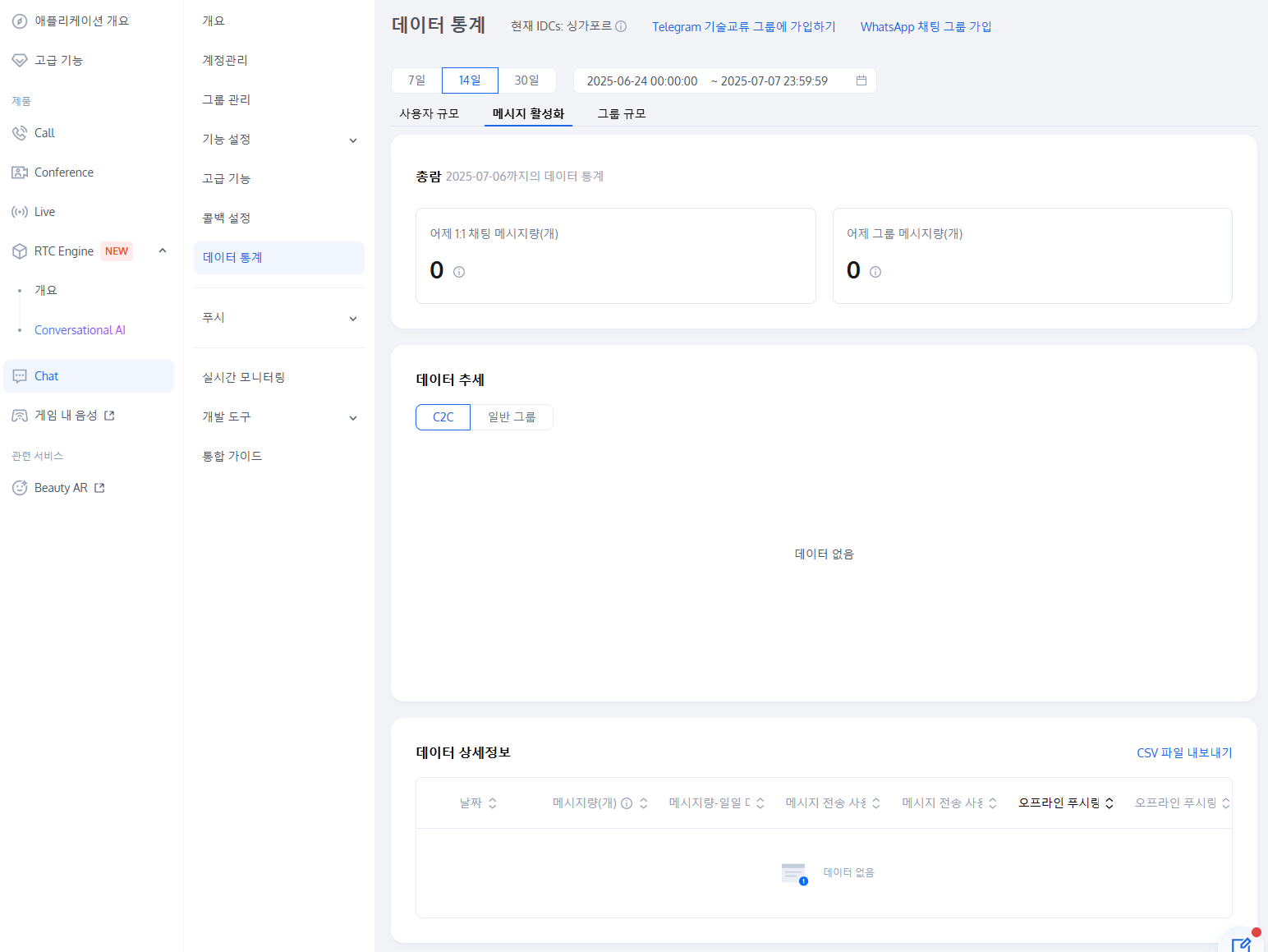 5. 데이터 세부 정보 영역에서 메시지 수, 메시지 수-일일 대비, 메시지 발신자 수, 메시지 발신자 수-일일 대비, 오프라인 푸시 수 및 오프라인 푸시 수-일일 대비를 포함하여 선택한 기간 동안의 일간 데이터를 볼 수 있습니다. CSV로 내보내기를 클릭하여 이러한 데이터를 내보낼 수도 있습니다.