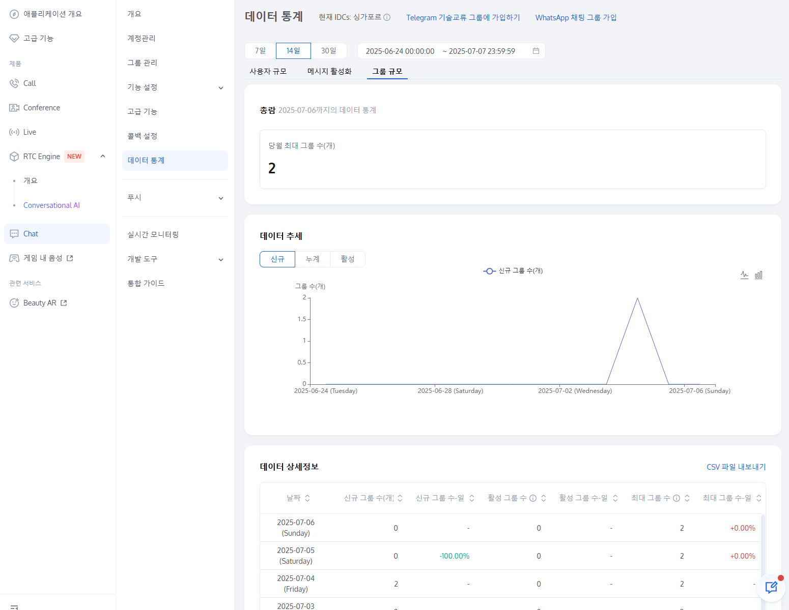 5. 데이터 세부 사항 섹션에서는 신규 그룹 수, 신규 그룹 수-일일 대비, 메시지 활성 그룹 수, 메시지 활성 그룹 수-일일 대비, 피크 그룹 및 피크 그룹-일일 대비를 포함한 선택한 기간 내의 일별 상세 데이터를 볼 수 있습니다. 또한, CSV 파일 내보내기를 클릭하여 데이터 테이블을 내보내기할 수 있습니다.