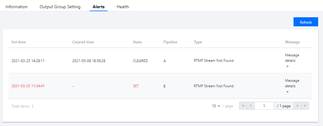 채널의 파이프라인에서 문제가 발생하거나 발생할 가능성이 있는 경우 StreamLive는 채널에 대한 경고를 생성합니다. Set time은 경고가 발생한 시간이고 Cleared time은 경고가 해제된 시간입니다. 경고 상태는 변경될 수 있습니다. 경고 상태가 SET이면 Set time 및 State 열이 빨간색으로 강조 표시되며, 경고가 지워지면 상태가 CLEARED로 변경되고 강조 표시가 제거됩니다. 지난 5일 동안 24시간 미만의 기간 동안 문제가 있는 파이프라인, 경고 유형 및 기타 세부 정보가 포함된 경고 데이터를 쿼리할 수 있습니다.