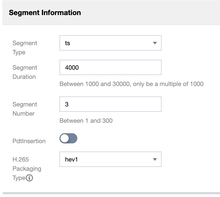 이 페이지에서 세그먼트 유형, 세그먼트 기간 및 세그먼트 번호를 포함하여 Segment Information을 지정할 수도 있습니다. AppleTV와 같은 일부 장치의 경우 H.265로 인코딩된 비디오를 재생하려면 Segment Type으로 fmp4를 선택하고 Packing Type으로 hvc1을 선택해야 합니다.