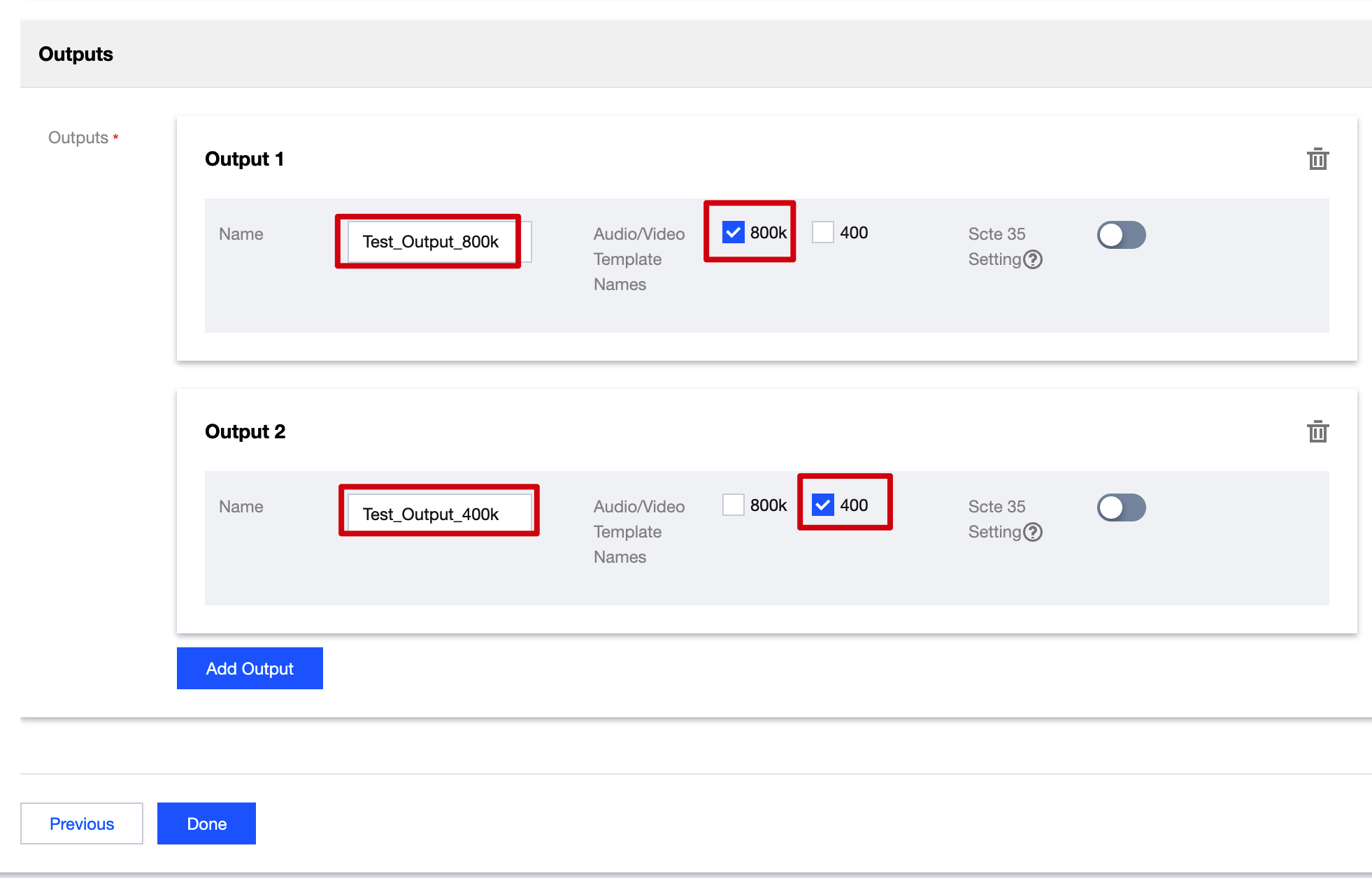 8. 출력 영역에서 각 출력의 이름을 입력하고 사용할 트랜스코딩 템플릿을 선택합니다. 완료를 클릭합니다.