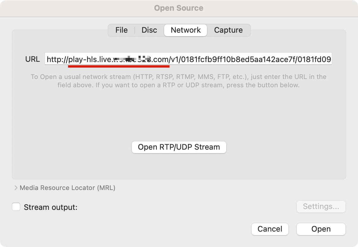 VLC를 열고(이 예시에서는 macOS용 VLC가 사용됨) File에서 Open Network를 클릭하고 네트워크 탭을 선택한 다음 StreamPackage Endpoint URL을 입력합니다(도메인 부분을 CSS에 구성된 재생 도메인으로 교체).
