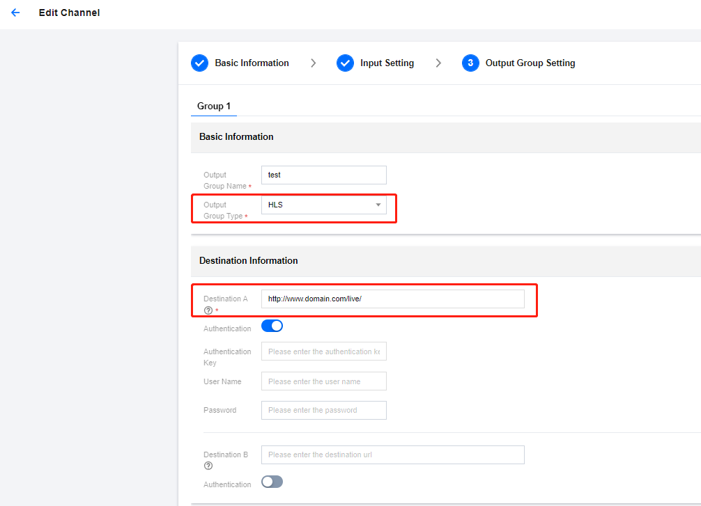Output Group Setting 페이지에서 Output Group Type으로 HLS/DASH를 선택하고 Destination에 HTTP 서버 주소를 입력합니다. Channel이 시작된 후 실시간 스트림은 실시간으로 대상 URL로 푸시됩니다.