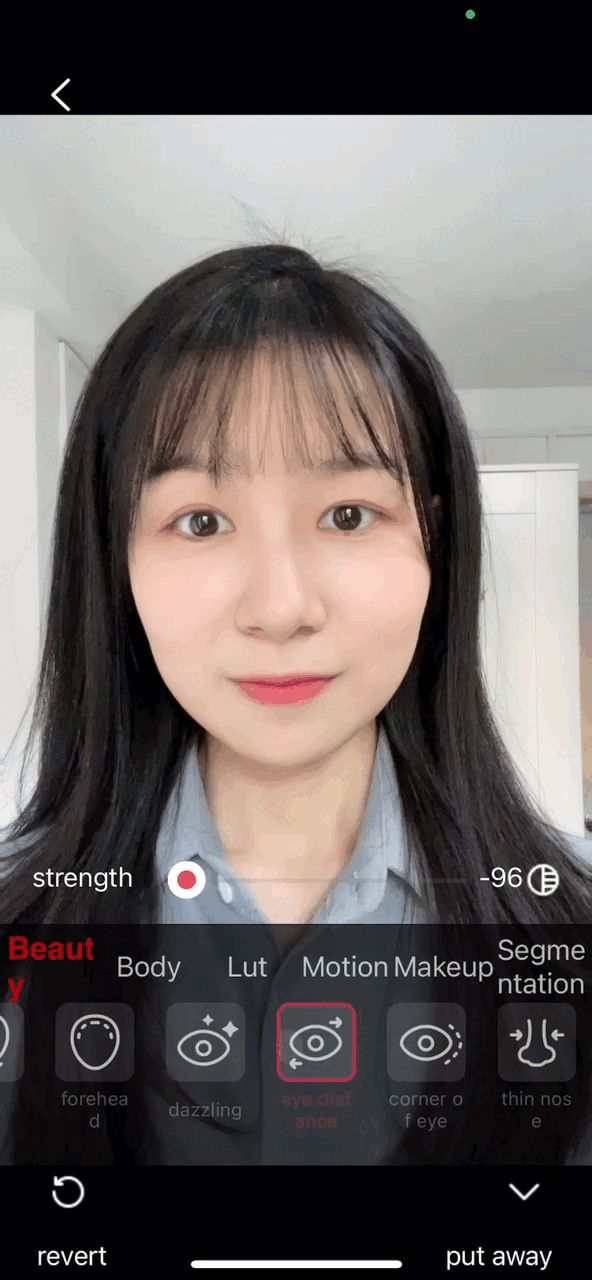 이 모듈은 스마트 뷰티 기능을 제공합니다. 피부 보정, 갸름한 얼굴, 눈 확대, 샤프닝, 미백, 작은 얼굴, 좁은 얼굴, 광대 축소, 코 축소, 입술 모양, 이마, 립스틱, 블러셔, 컨투어링, 치아 미백, 다크 서클 제거, 팔자 주름 제거, 피부톤 조절, 채도 조절, 대비 조절, 주름 제거, 눈꼬리 보정, 얼굴 축소, 눈매 보정, 콧날 보정, 코 위치 조절, 눈밑 처짐 제거, 입술 두께 조절, 미간 조절, 턱 모양 보정 등 약 30가지의 얼굴 특징 보정을 지원합니다.
