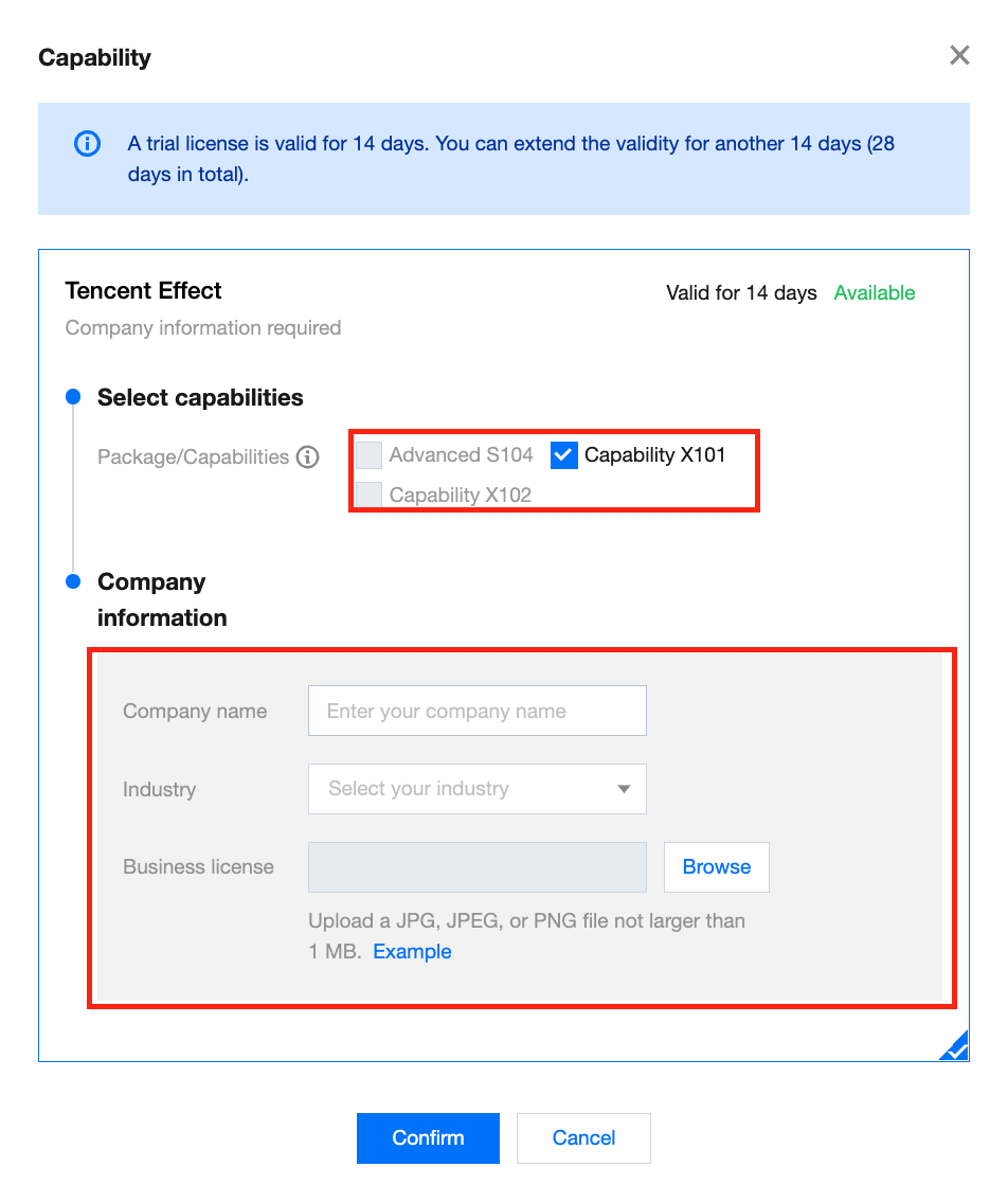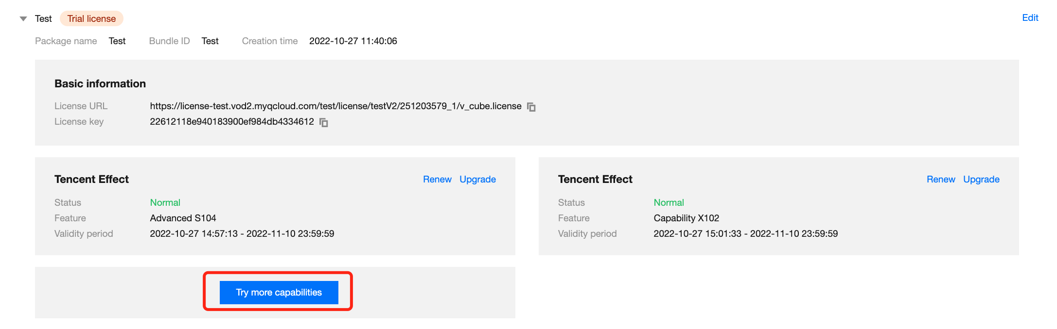 Tencent Effect SDK를 사용해 보려면 평가판 License를 신청할 수 있습니다. 평가판 License는 14일 동안 유효하며 한 번(총 28일) 갱신할 수 있습니다.