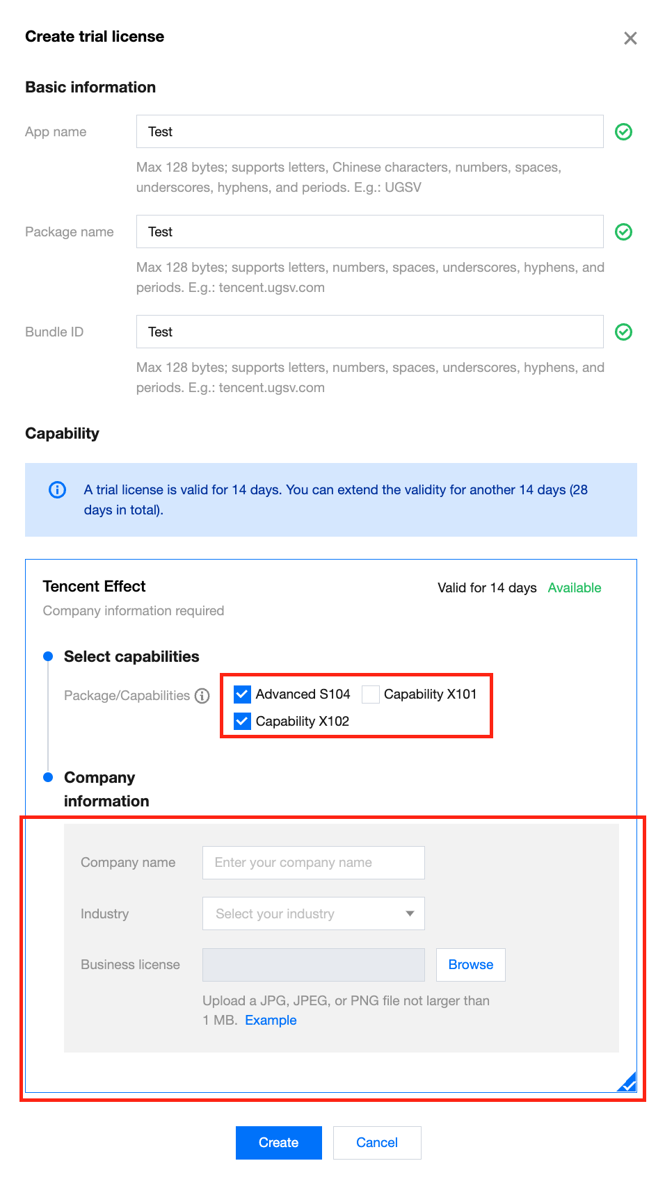 Tencent Effect 라이선스를 발급받기 전에 검토를 통과해야 합니다. 평가판 라이선스는 검토를 통과하는 순간부터 유효합니다. 처음 14일 후에 평가판 라이선스를 갱신하는 경우 라이선스의 새로운 만료일은 갱신일로부터 14일 이후가 됩니다.