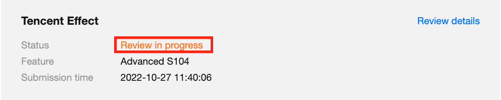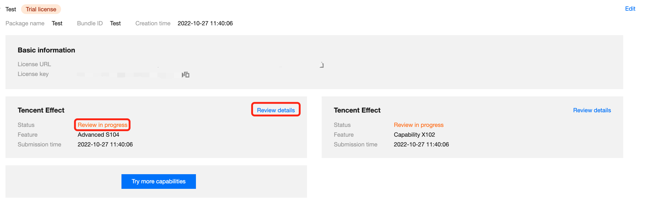 회사 정보를 제출하면 Tencent Effect 모듈의 상태가 검토 진행 중으로 변경됩니다. 검토 프로세스는 일반적으로 1-2일이 소요됩니다. 회사 정보를 2022-05-24 12:47:33(UTC+8)에 제출하고 2022-05-24 15:23:46(UTC+8)에 검토를 통과했다고 가정할 때, 평가판 라이선스는 14일 후 2022-06-09 00:00:00(UTC+8)에 만료됩니다.