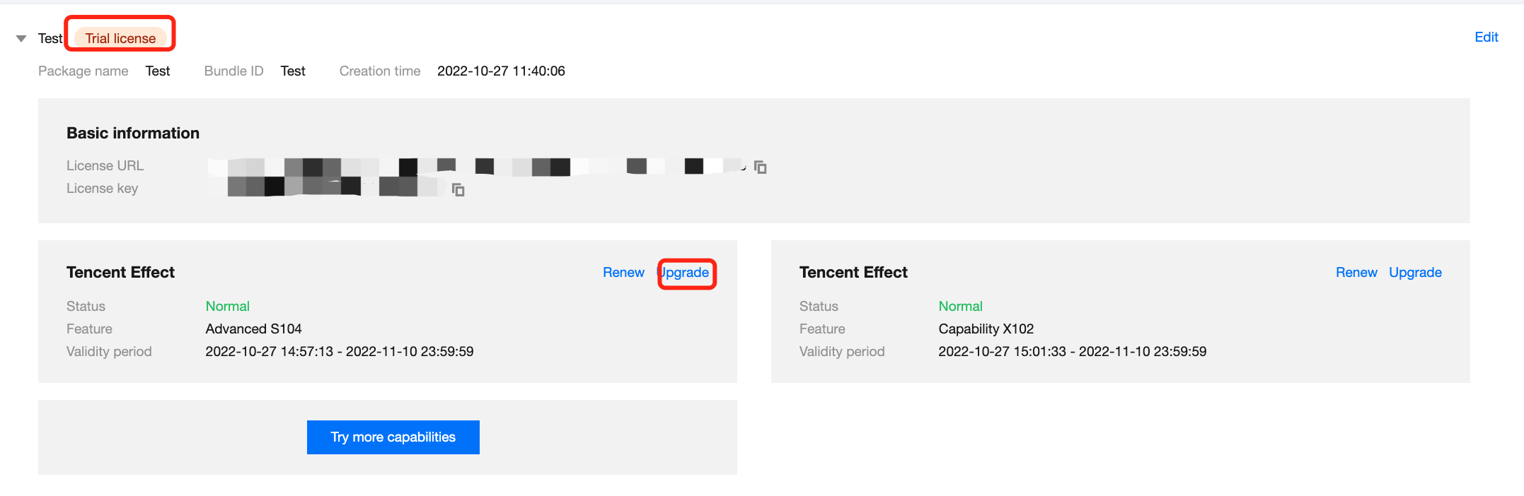 Tencent Effect의 평가판 License는 한번만 갱신할 수 있습니다. 즉, 평가판 License를 최대 28일 동안 사용할 수 있습니다. 평가판 License가 만료된 후에도 Tencent Effect를 계속 사용하려면 공식 License를 구매하십시오. 공식 License로 업그레이드