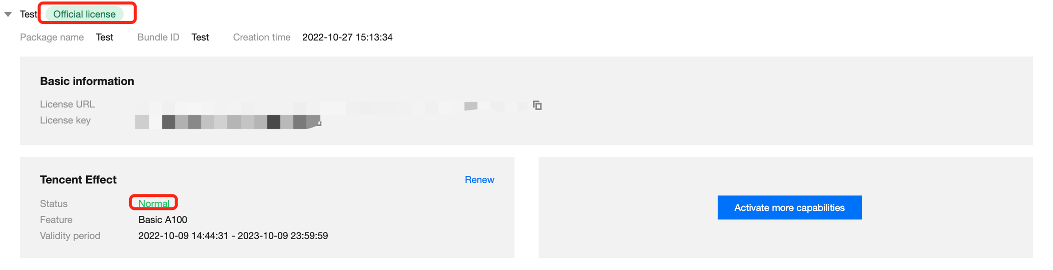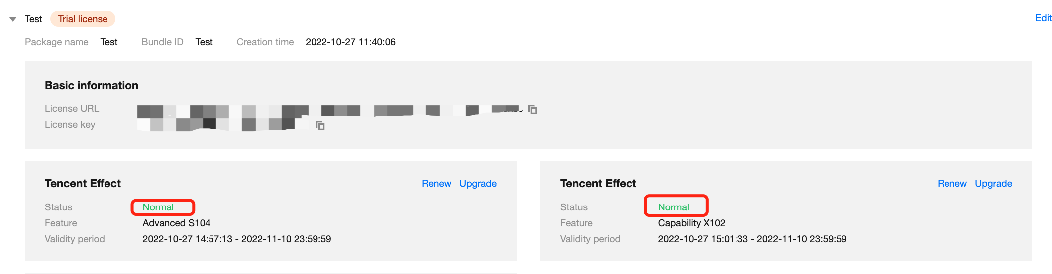 2. 검토를 통과하면 모듈 상태가 정상으로 변경되며 이는 평가판 License가 발급되었음을 나타냅니다. Tencent Effect를 사용해 볼 수 있습니다.