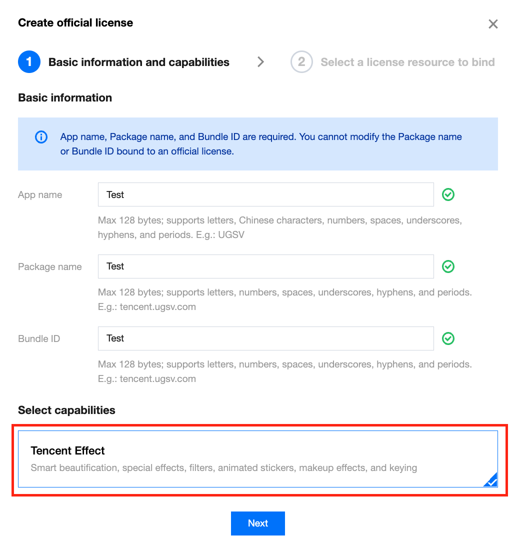 2. App Name, Package Name 및 Bundle ID를 입력하고 Tencent Effect를 선택한 후 다음을 클릭합니다.