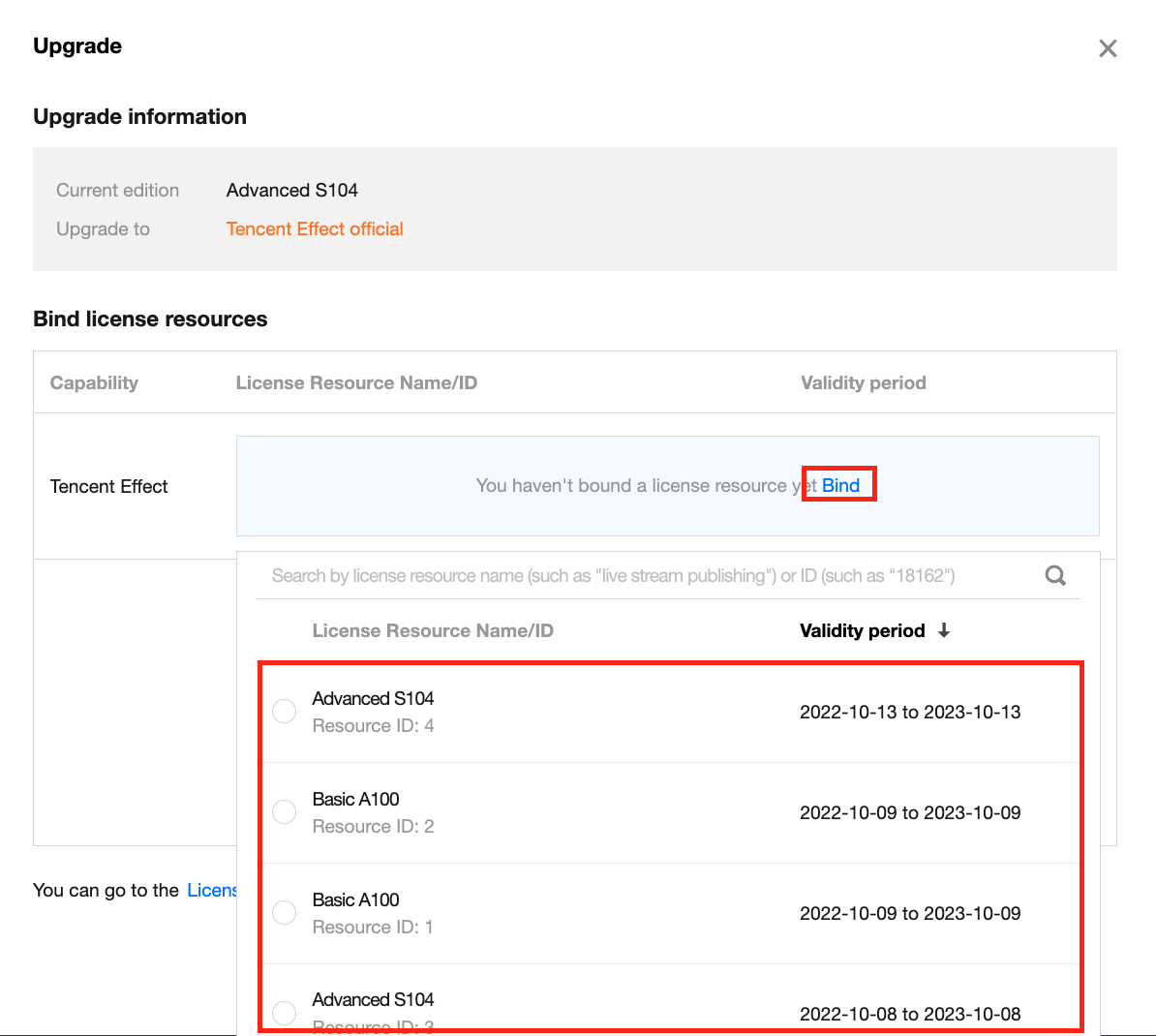 3. 바인딩을 클릭하고 구매한 Tencent Effect 에디션을 선택한 다음 확인을 클릭합니다. 바인딩할 에디션이 없다면 구매 페이지로 이동하여 에디션을 구매하십시오. 주의사항: