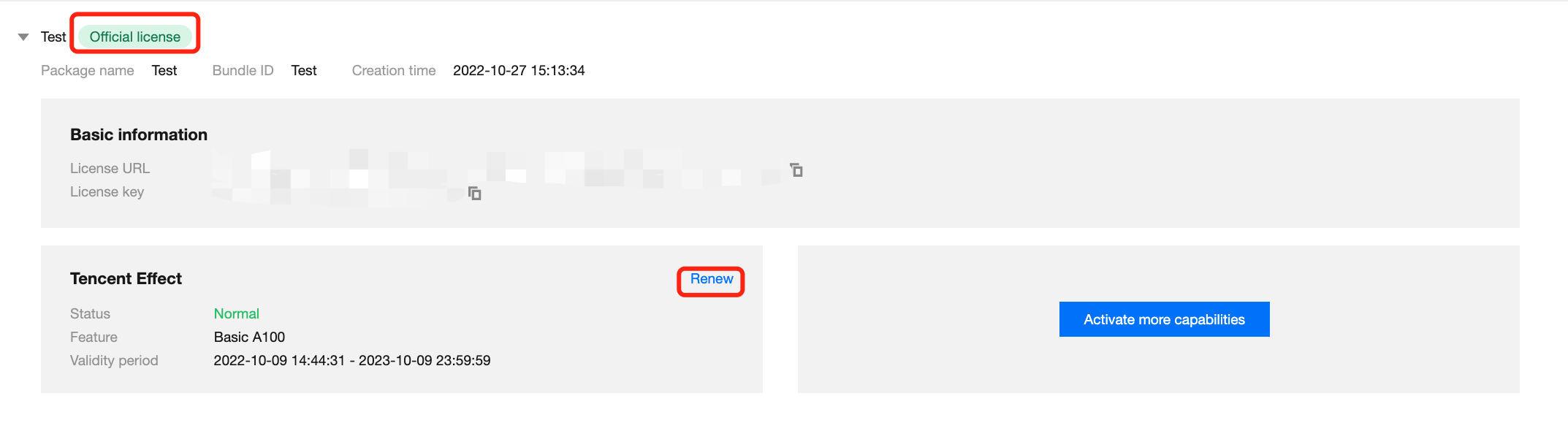 1. Tencent Effect 기능을 추가할 기존 공식 라이선스를 선택하고 추가 기능 활성화를 클릭합니다.