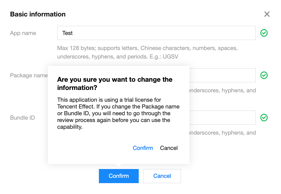 1. 평가판 License에 바인딩된 Bundle ID 및 Package Name을 수정하려면 오른쪽 편집을 클릭하고 수정 후 확인을 클릭합니다. Tencent Effect 모듈을 계속 사용하려면 검토 과정을 다시 거쳐야 합니다.