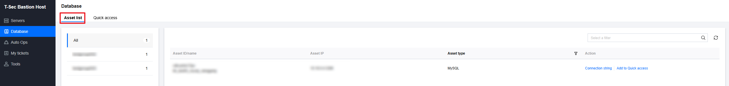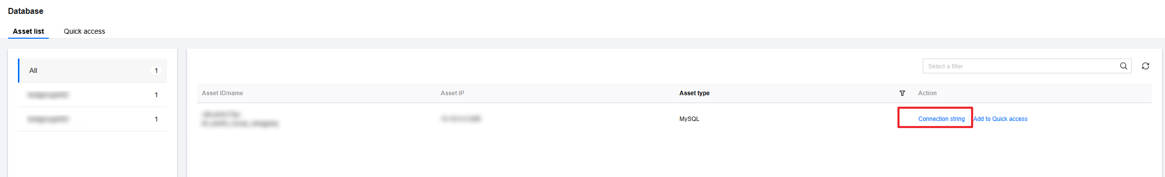 3. On the Database Asset List page, click Connection string on the right side of the corresponding database to open the connection string window.