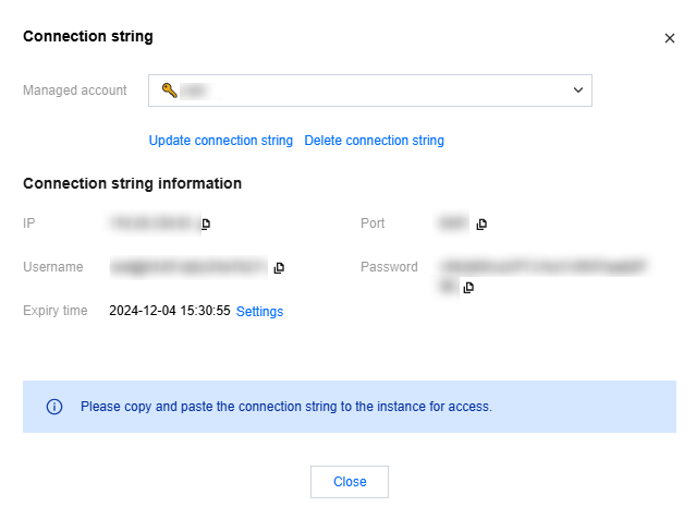 6. After you configure and save the connection string, it can be used to access the database within its validity period.