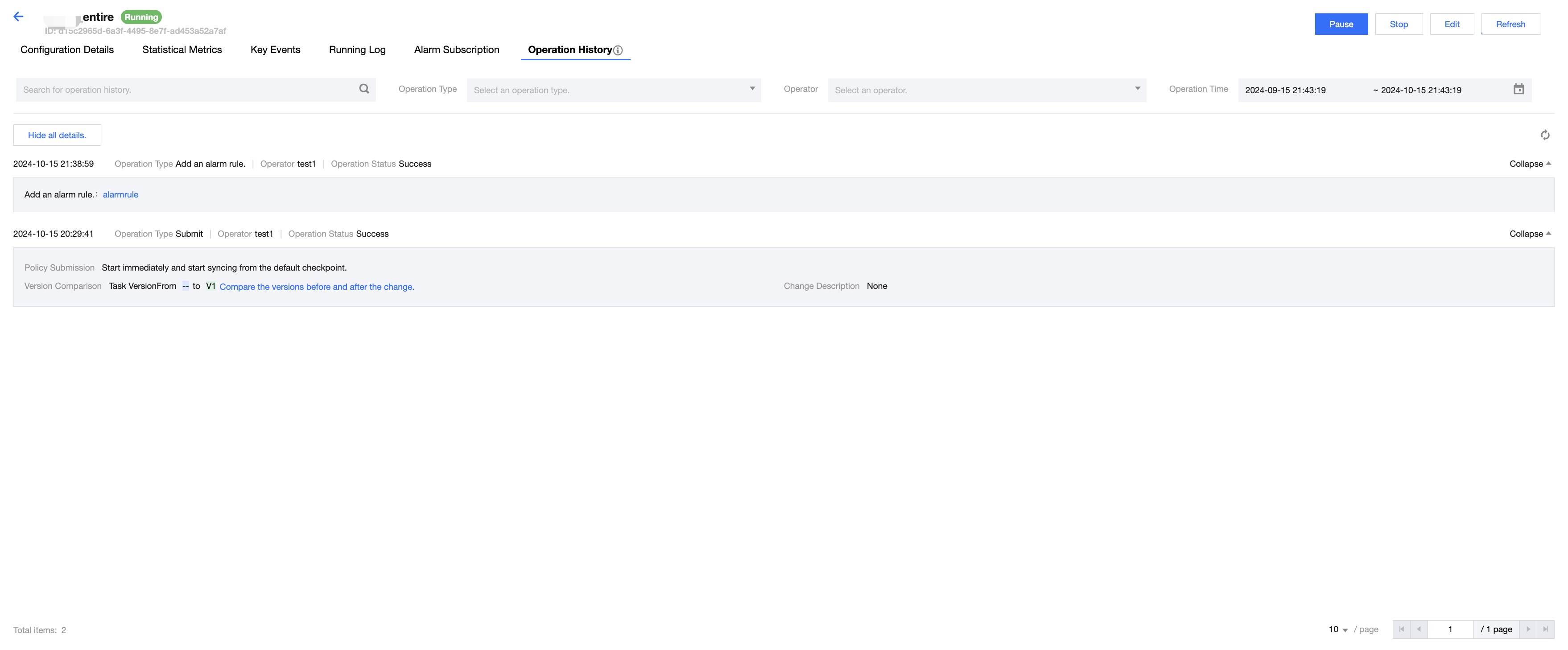 Operation Type | Supports selecting options such as Select All, Submit, Run, Stop, Pause, Force Pause, Continue, Delete, Add Alert Rule, Remove Alert Rule, Modify Responsible Person |