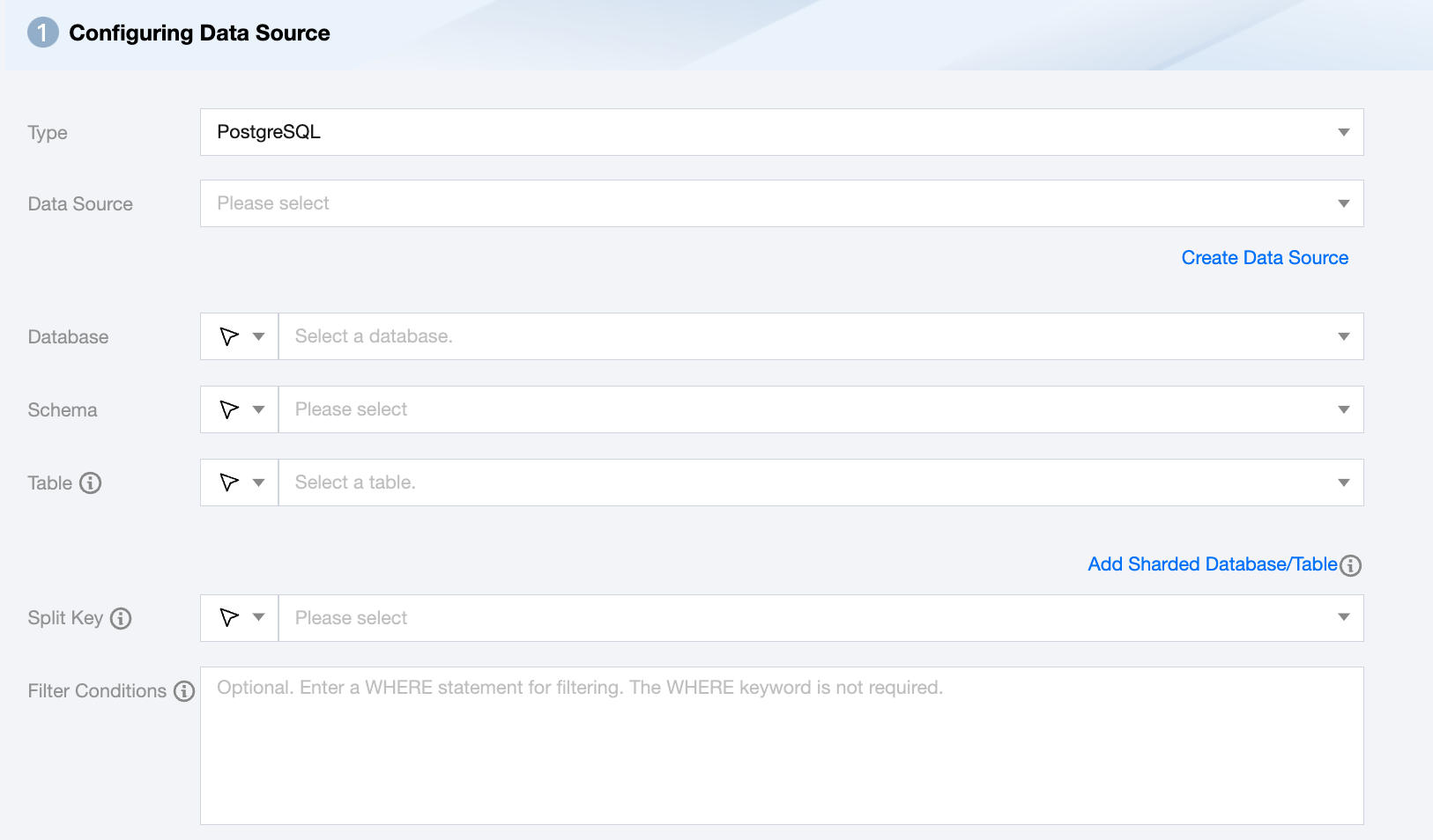 Filter Conditions (Optional) | PostgreSQL concatenates the SQL based on the specified WHERE condition and performs data extraction according to that SQL. For example, during testing, you can specify the WHERE condition for the actual business scenario, usually syncing the data of the day by setting the WHERE condition to id>2 and sex=1. |