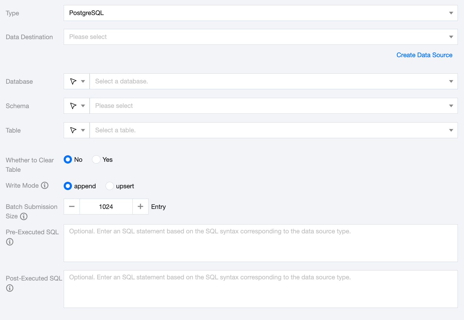 Pre-Executed SQL(Optional) | The SQL statement executed before the synchronization task. Fill in the correct SQL syntax according to the data source type, such as clearing the old data in the table before execution (truncate table tablename). |