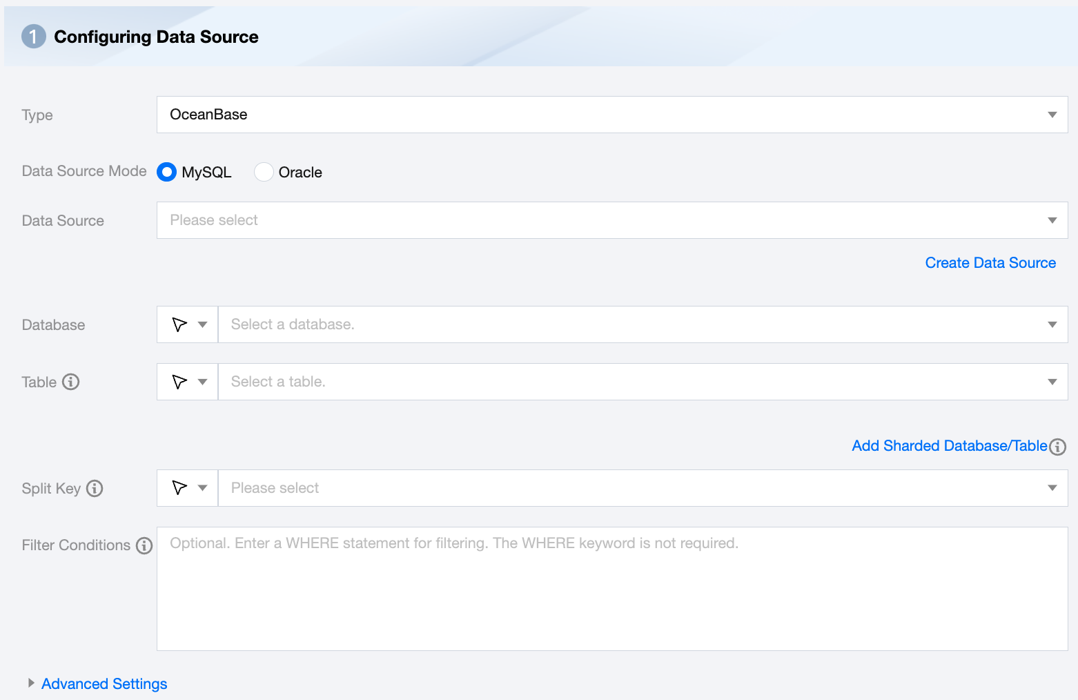 Split Key | You can use a column from the source data table as a split key; it is recommended to use the primary key or an indexed column as the split key. Only fields of integer type are supported. When reading data, data sharding is performed based on the configured fields to achieve concurrent reading, improving data synchronization efficiency. |