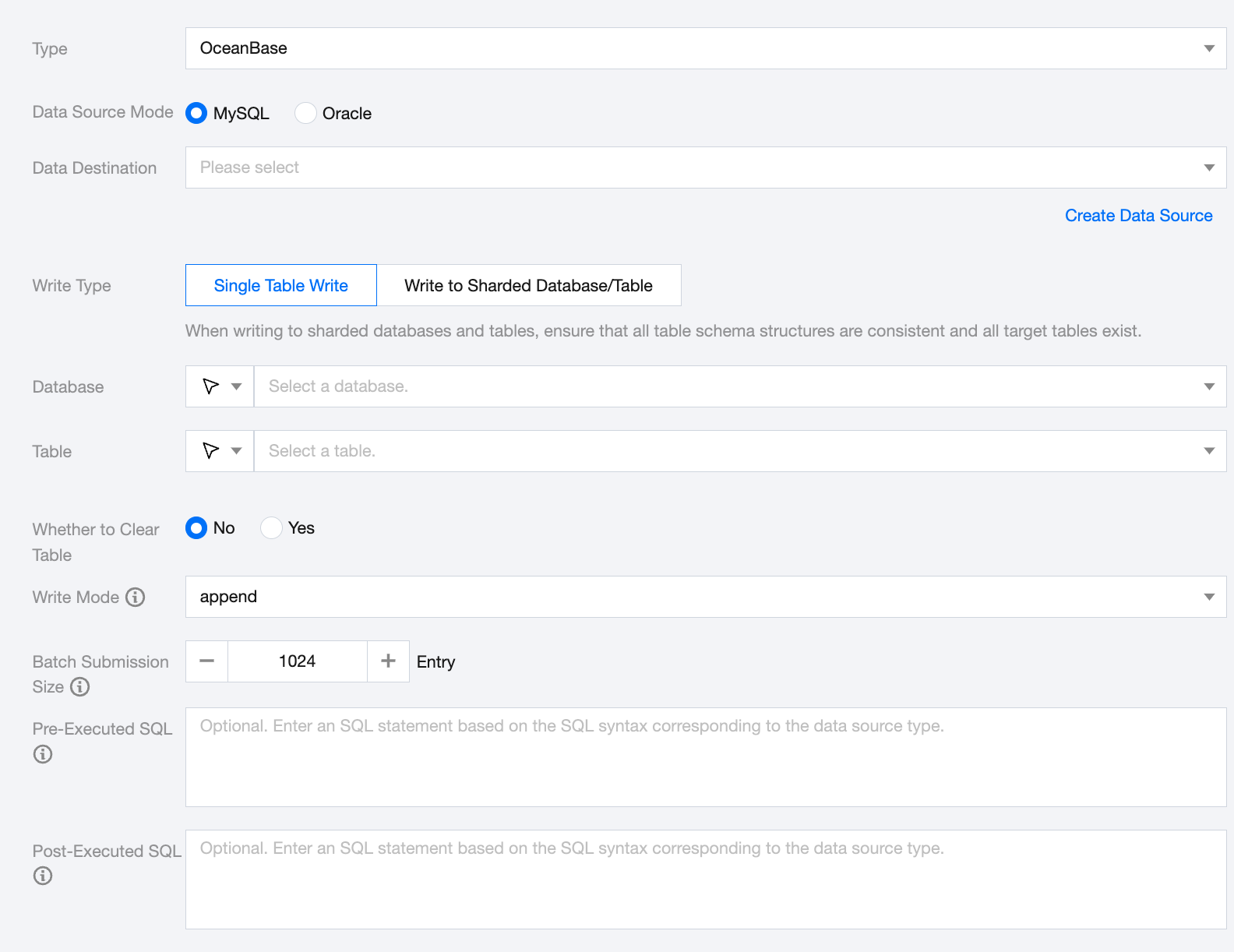 Write Type (MySQL Compatibility Mode) | Single table write: Supports single table writing Write to Sharded Database/Tables: Supports one-time writing into sharded MySQL tables within the same data source. Ensure all table schemas are consistent and all target tables exist. |