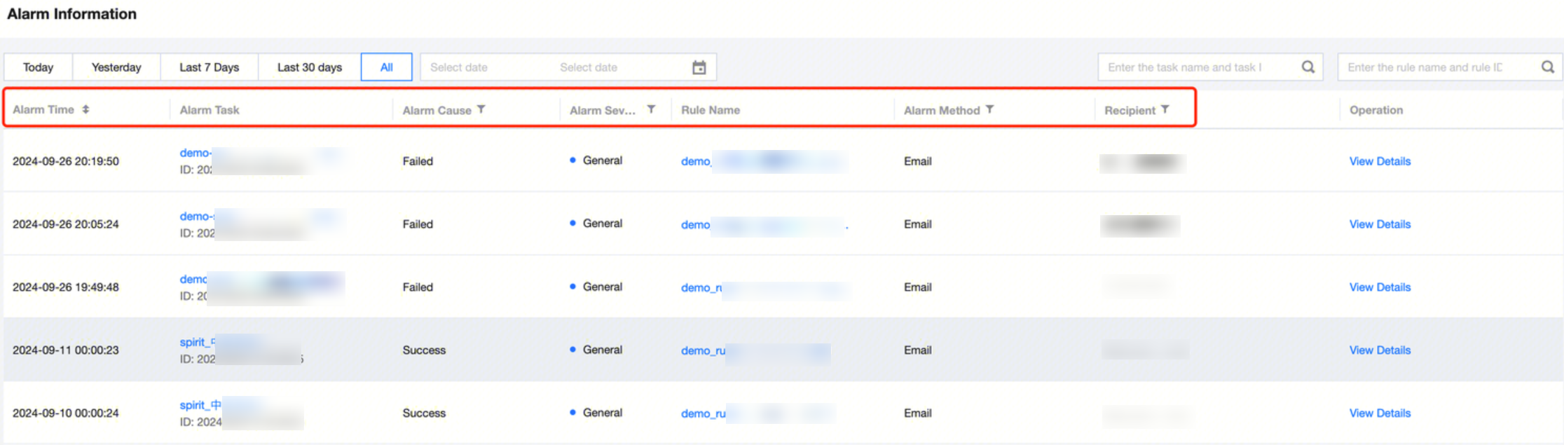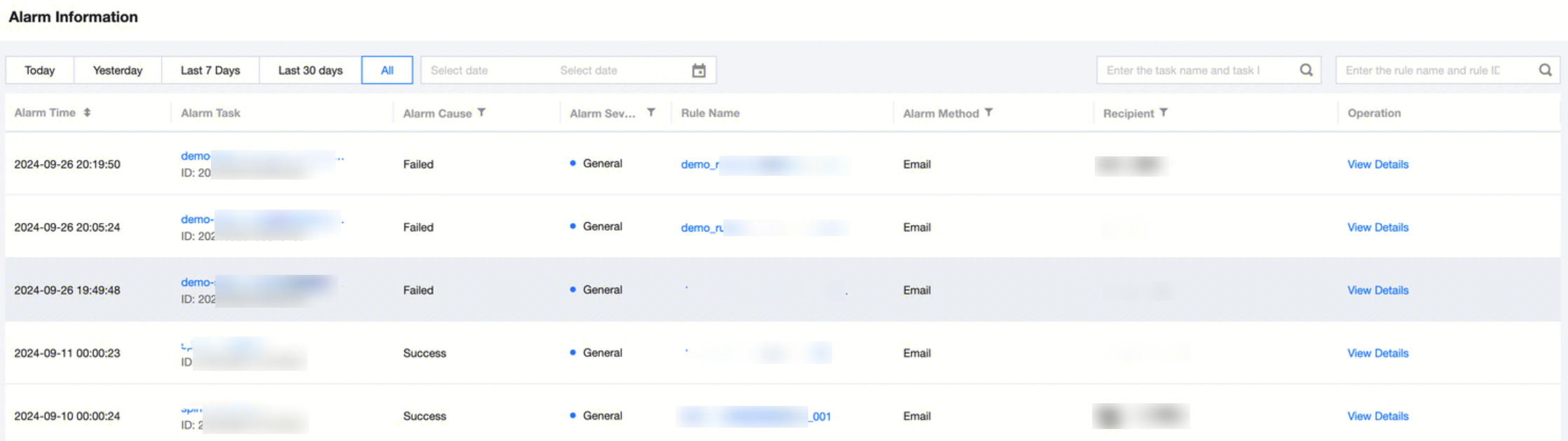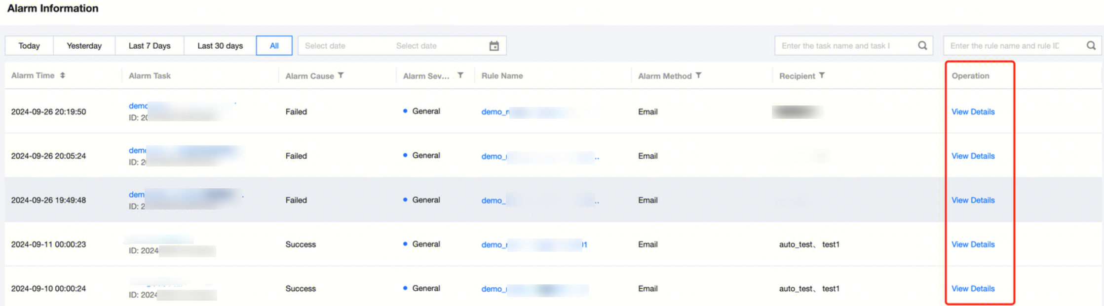 Alarm Task | Display the name and instance ID of the task instance that triggered the alarm information. Click the instance name to jump to the corresponding instance management page. |
