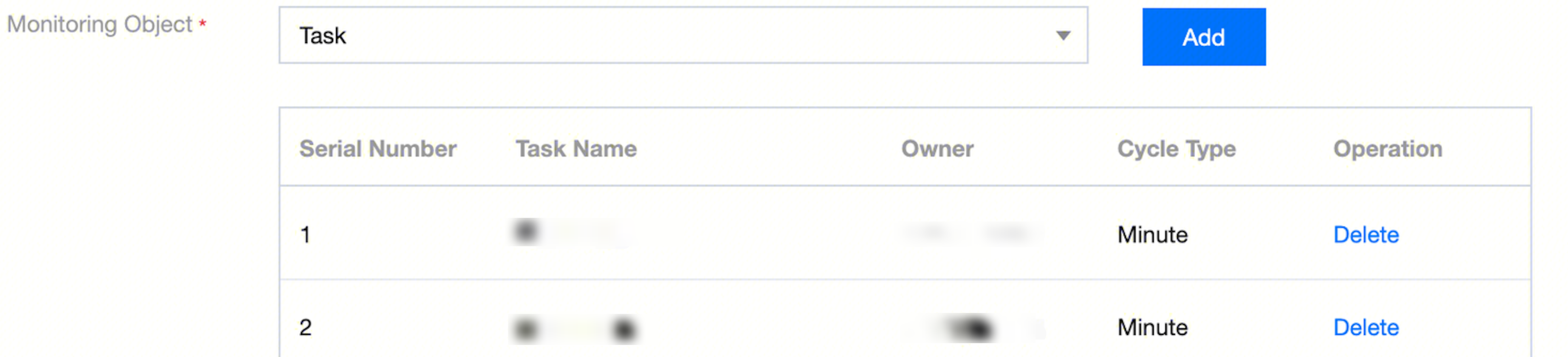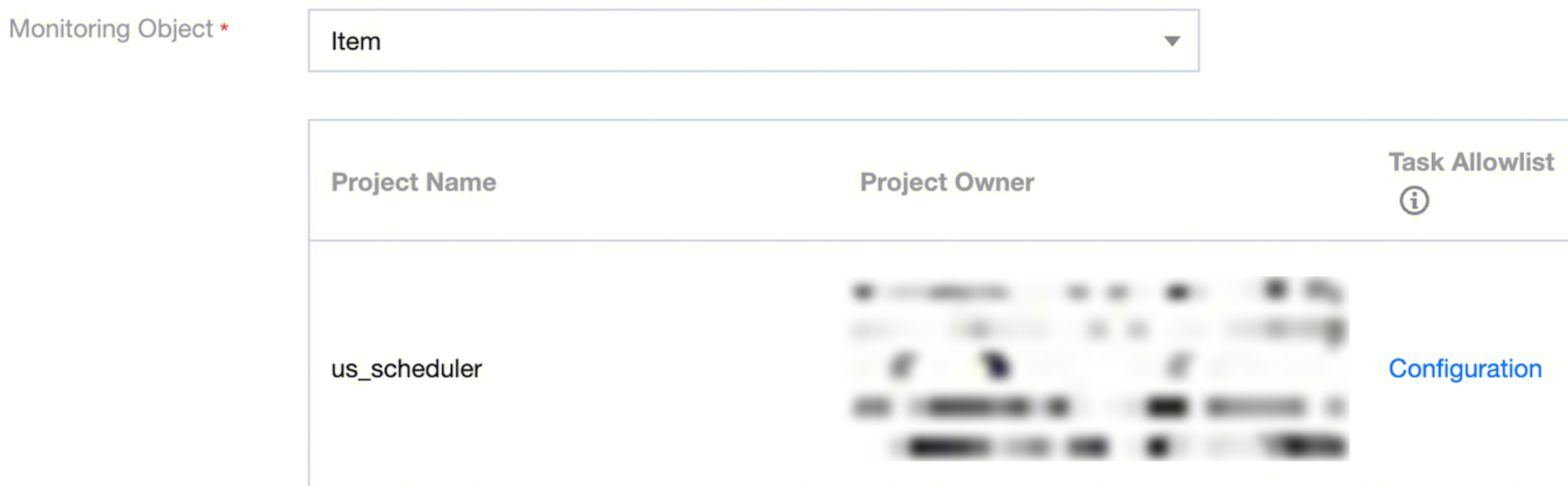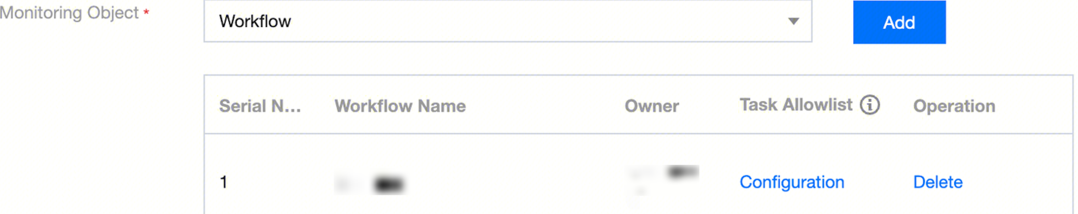 | Monitoring Object | Select the monitoring object for which you want to set the alarm rules. Currently, computing tasks, workflows, and project configuration alert rules are supported. Task Alerts: You can configure alarm rules for all computing task nodes that have been submitted to operations in the orchestration space. ![]() Workflow Alerts: You can configure alarm rules for workflows that have been submitted to operations in the orchestration space. The monitoring objects of the rules are all computing tasks within the workflow. The allowlist capability is provided; tasks added to the allowlist will not be monitored by the alarm rules. ![]() Project Alerts: Alarm rules can be set for all computing tasks that have been submitted to operations in the orchestration space within the current project. The allowlist capability is provided; tasks added to the allowlist will not be monitored by the alarm rules. ![]() |