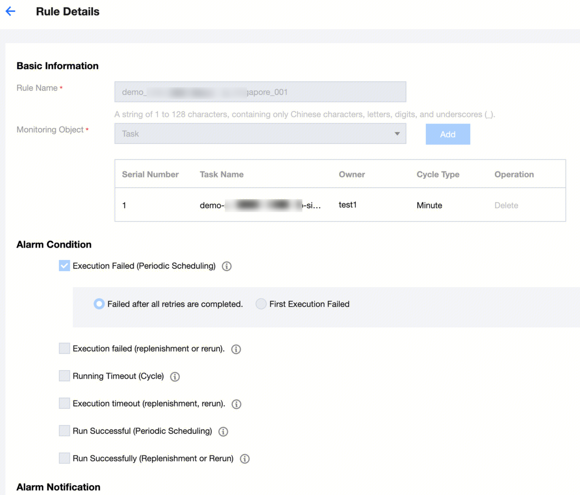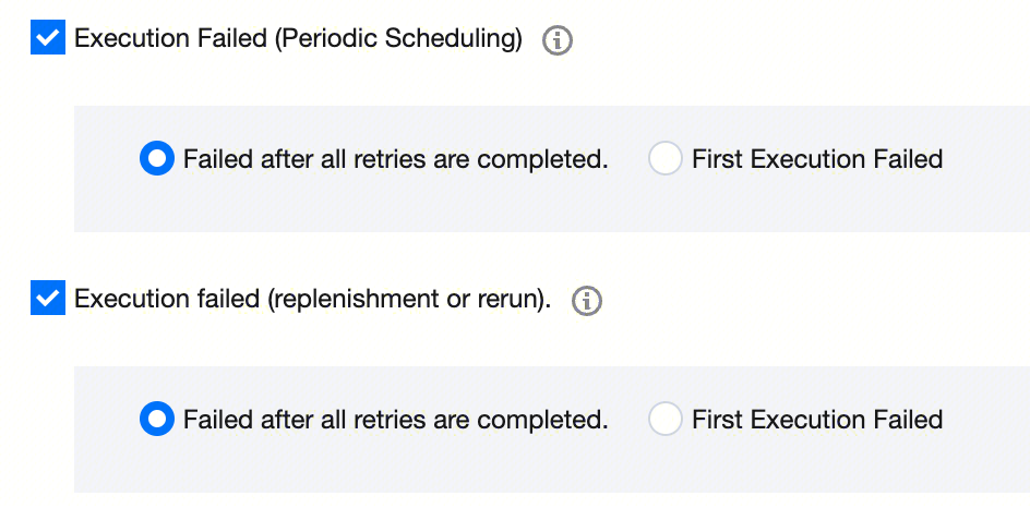 Alarm Conditions | Operation Failure | An alert is triggered when the monitored task's instance fails to run. Configuration can be made for periodic execution, supplemental entries, or rerun execution. The rule trigger condition can be either "Failed after all retries are completed" or "First Execution failed". Failed after all retries: According to the computational task scheduling strategy, if failure retries are configured, the alarm rule is triggered when all retries fail, and the instance fails. First run failed: According to the computational task scheduling strategy, the alarm rule is triggered when the instance generated from the first run fails. ![]() |