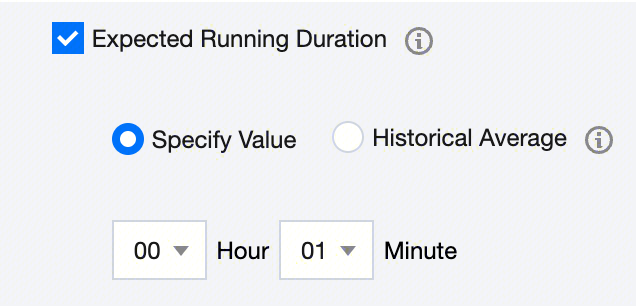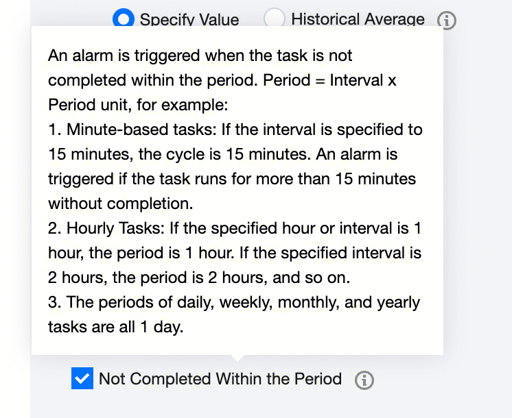 | Operation Timeout | An alert will be triggered when a monitored task generates instance scheduling or exceeds the preset runtime. Configuration can be done for periodic execution or supplemental entry, as well as for rerun execution. Rules can be set for the following four key time requirements: "Estimated Running Time", "Estimated Completion Time", "Expected Waiting Time for Scheduling", and "Incomplete within Cycle". Expected Running Time: Calculated from the task instance start time. If not completed within the required time, an alert is triggered. You can use "Specified Value" or "Historical Average" to limit instance running time. Specified Value: If the instance is not completed within the specified hour and minute time requirement, an alert rule is triggered. Historical Average: Takes the instance running time of the last 10 successful runs of the computing task, removes the maximum and minimum values, and then takes the average. If less than 10 runs, it is invalid. ![]() Estimated Completion Time: Calculated from the task instance start time. If not completed by the prescribed time point, an alert is triggered. You can use "Specified Value" or "Historical Average" to specify the time point by which the instance needs to be completed. Specified Value: If the instance is not completed before the specified hour/minute time point, an alert rule is triggered. Historical Average: Takes the instance running time of the last 10 successful runs of the computing task, removes the maximum and minimum values, and then takes the average. If less than 10 runs, it is invalid. ![]() Estimated Time of Waiting for Scheduling: Limits the interval time from the planned scheduling time of the task instance to the actual start time. If it exceeds the set time period and has not started, an alert is triggered. ![]() Incomplete within Cycle: An alert is triggered when the task instance does not complete within its current running cycle. Cycle = Interval * Periodic Unit, for example: Minute Task: For a task with a 15-minute interval, the cycle is 15 minutes. Alert is triggered if the task exceeds 15 minutes without completion. Hourly Task: If specified hour or interval is 1, the cycle is 1 hour; if the interval is 2, the cycle is 2 hours, and so on. Day, Week, Month, and Annual Task: The cycle is 1 day. ![]() |