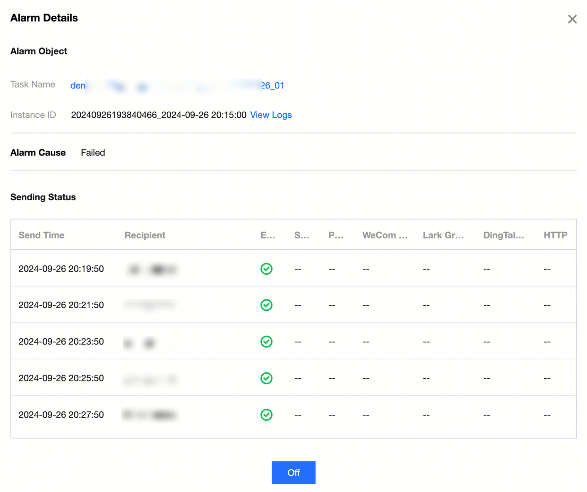 | Recipient | After the alarm rule is triggered, an alarm message will be sent to the recipient. Currently, three methods are supported for setting alarm message recipients: "Designated Personnel", "Task Owner", and "On-duty Schedule". Designated Users: You can specify one or multiple users as alert message recipients. Task Owner: The owner of the task is set as the alert message recipient. Duty Schedule: The pre-scheduled duty roster is set as the recipient, and alert messages will be sent to the duty users. |