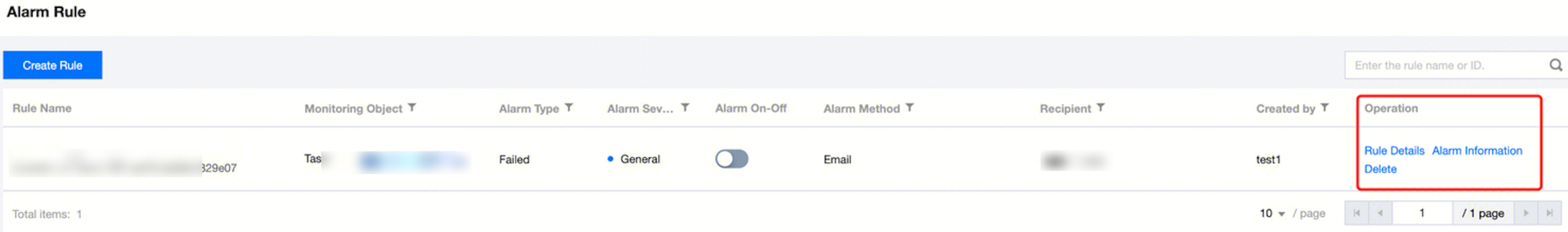 Rule Details | The rule details allow you to view various parameters configured when setting up the alarm rules, including rule name, monitored object, monitoring tasks, alarm conditions, and alarm notifications. ![]() |