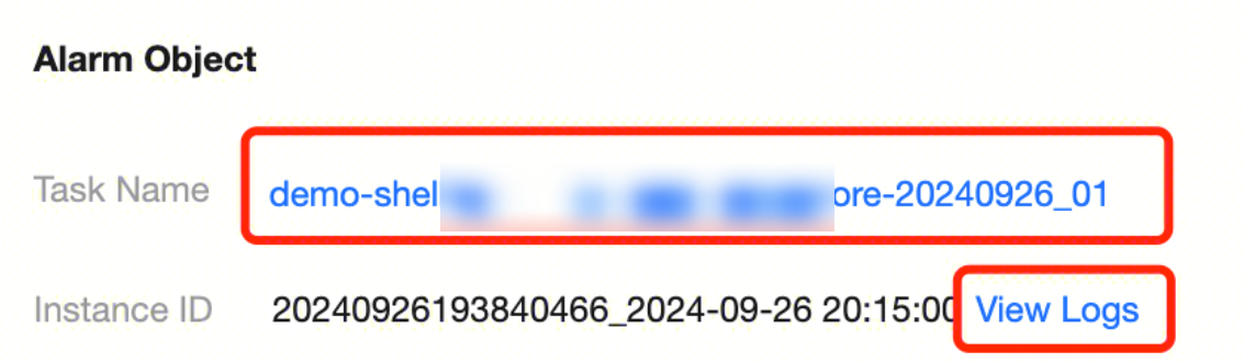 Alarm Object | Displays the task instance name and instance ID that triggered the alarm information. ![]() Task Name: Displays the name of the computing task that triggered the alarm information. Click the task name to navigate to the page where the instance triggering the alarm is located. Instance ID: Displays the instance ID that triggered the alarm information. Click 'View Logs' to navigate to the log information page of the corresponding instance. |