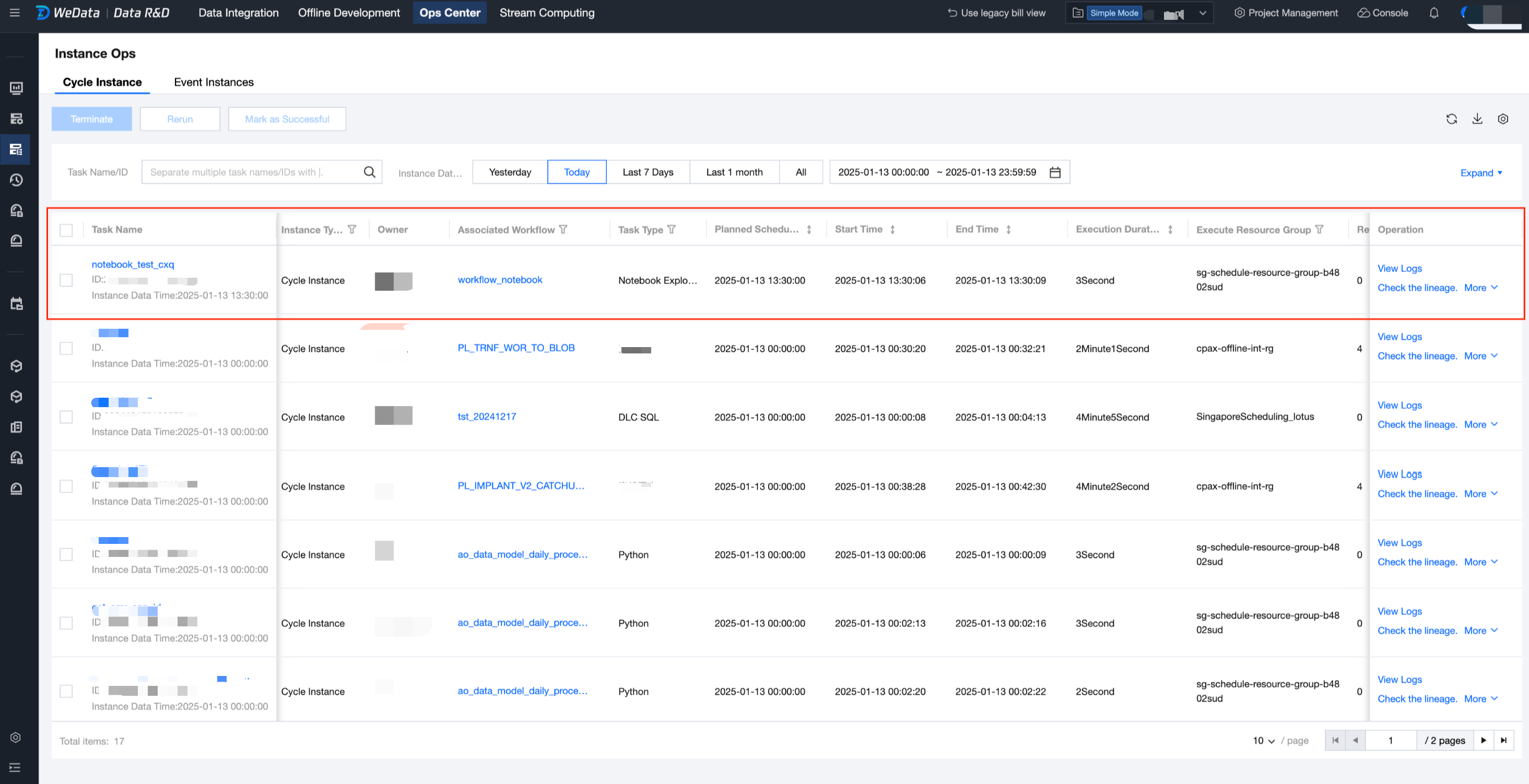 Click Instance Ops to view each periodic instance generated by the above workflow.