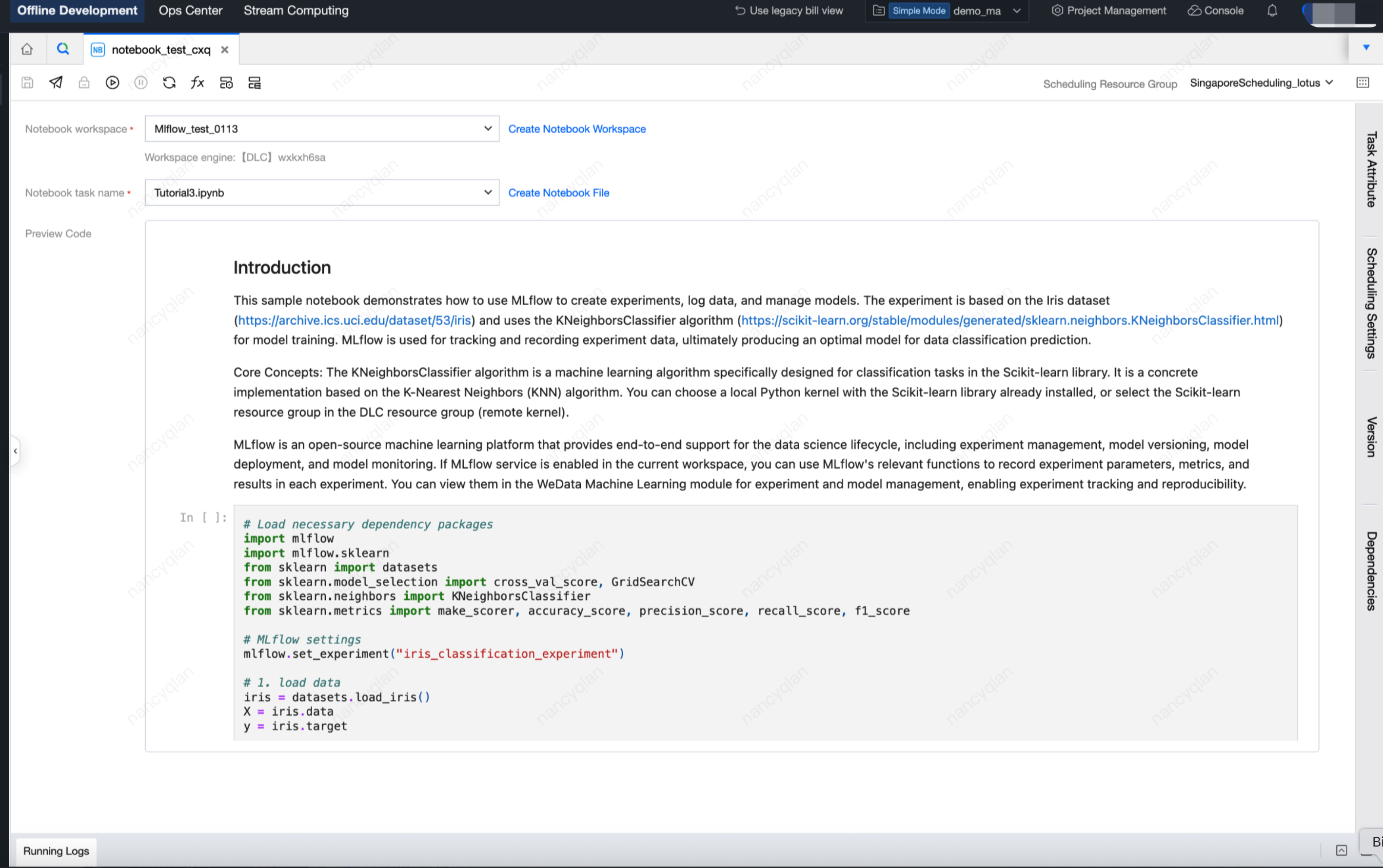 MLflow is an open-source machine learning platform that provides end-to-end support for the data science lifecycle, including experiment management, model versioning, model deployment, and model monitoring. If MLflow service is enabled in the current workspace, you can record each experiment’s parameters, metrics, and results by calling MLflow functions. These records can then be viewed under WeData Machine Learning > Experiment Management and Model Management, enabling experiment tracking and reproducibility.