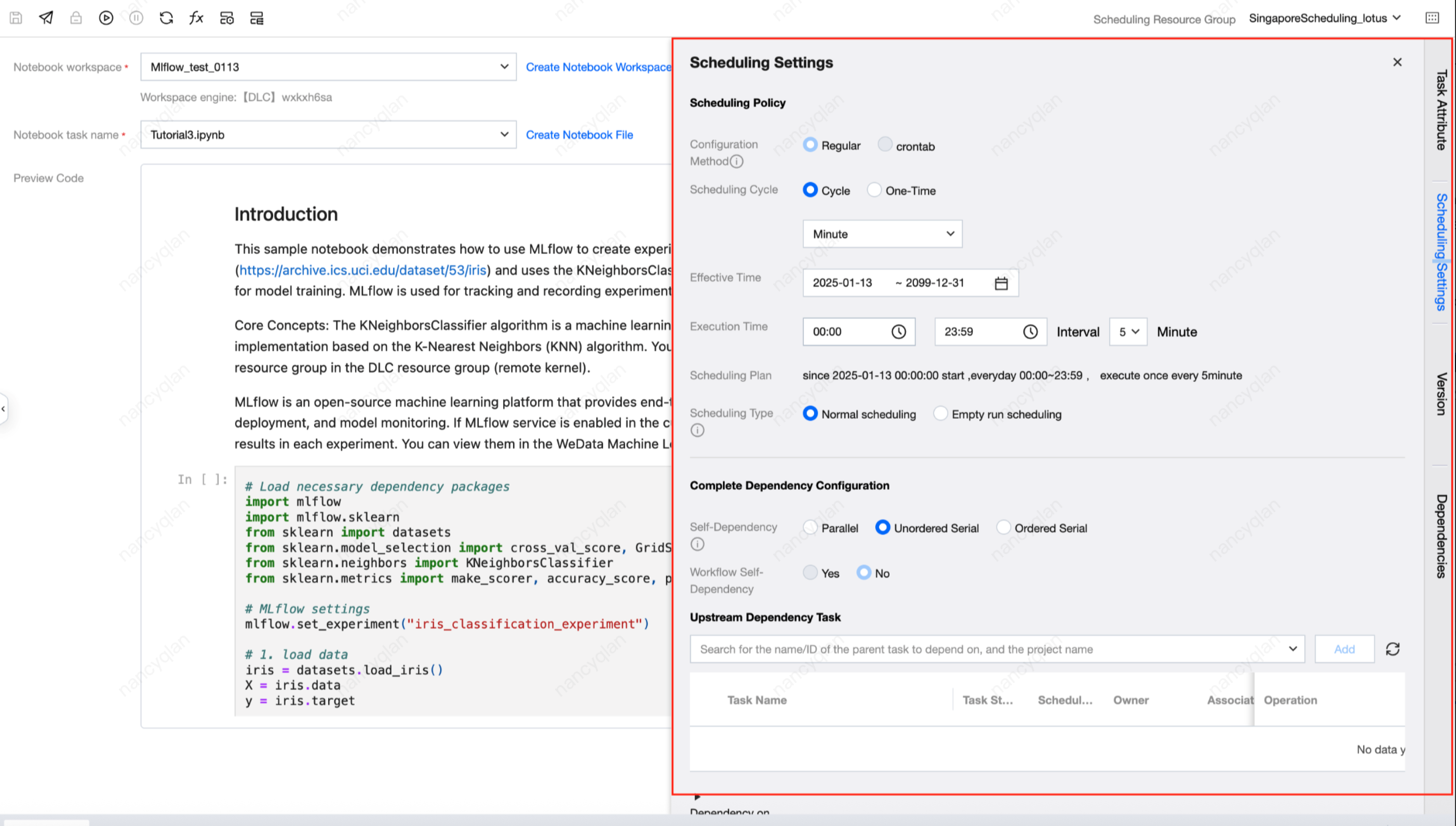 1. Click on the right Scheduling Configuration, set the scheduling interval of the current Notebook Task, for example, the figure below is set to run once every 5 minutes.