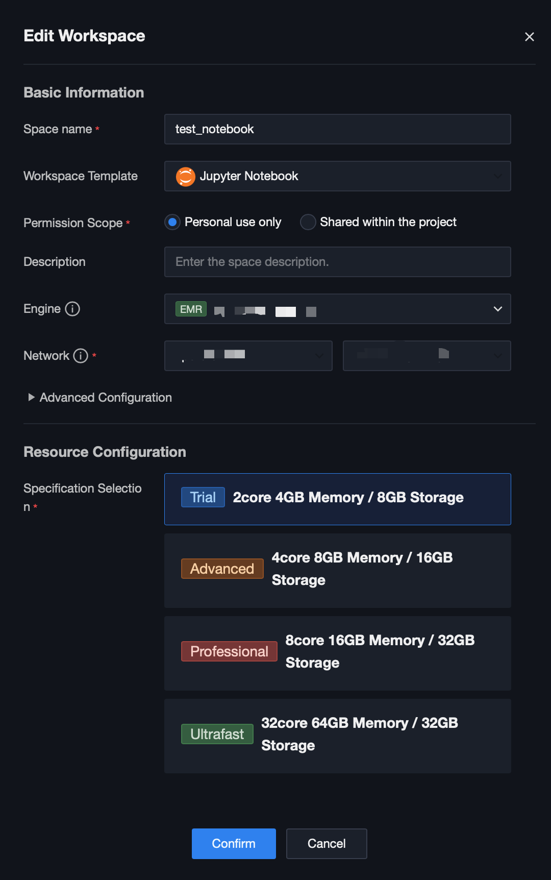 Space Name | Name of the Notebook workspace. Supports Chinese, English, numbers, underscores (_), and hyphens (-), with a maximum length of 32 characters. | Yes |