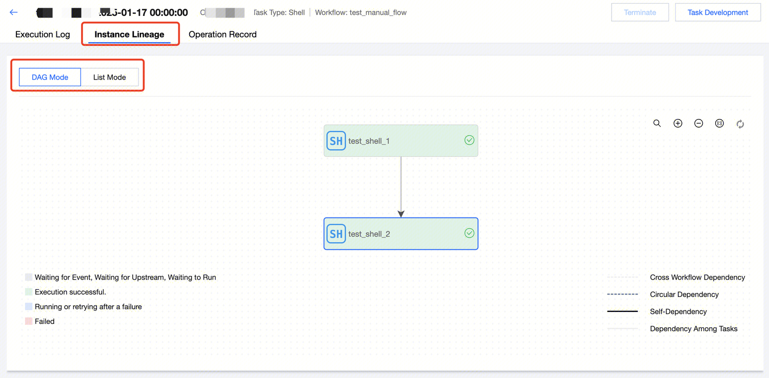 Instance Lineage | View the upstream and downstream relationships between the current compute task instance and other compute task instances within its workflow, and it also displays the running state and detailed information of each compute node, with different colors indicating the instance's running state. DAG Mode: View instance lineage through graph mode, which can be expanded layer by layer. Basic instance operations are supported. ![]() List Mode: View instance lineage through list mode, with options to view upstream or downstream. ![]() |