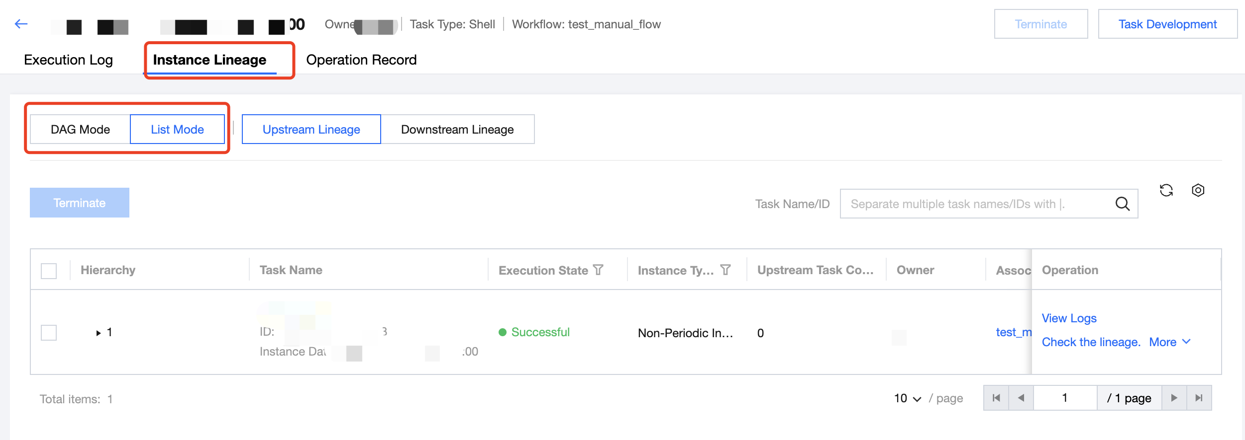 Third-level List | The third-level list is at the instance level, displaying instance-related information and operations. Information includes: instance data time, execution status, start time, end time, execution duration. Operations include: view logs, view lineage, termination, task development. View logs: Redirect to the instance Details Page to view run log information. View lineage: Redirect to the instance details page to view instance lineage. Termination: Task instances in the states of waiting for events, waiting for upstream, waiting to run, or running can be terminated using the termination feature. Task Development: Click to navigate to the orchestration space and open the corresponding task. |