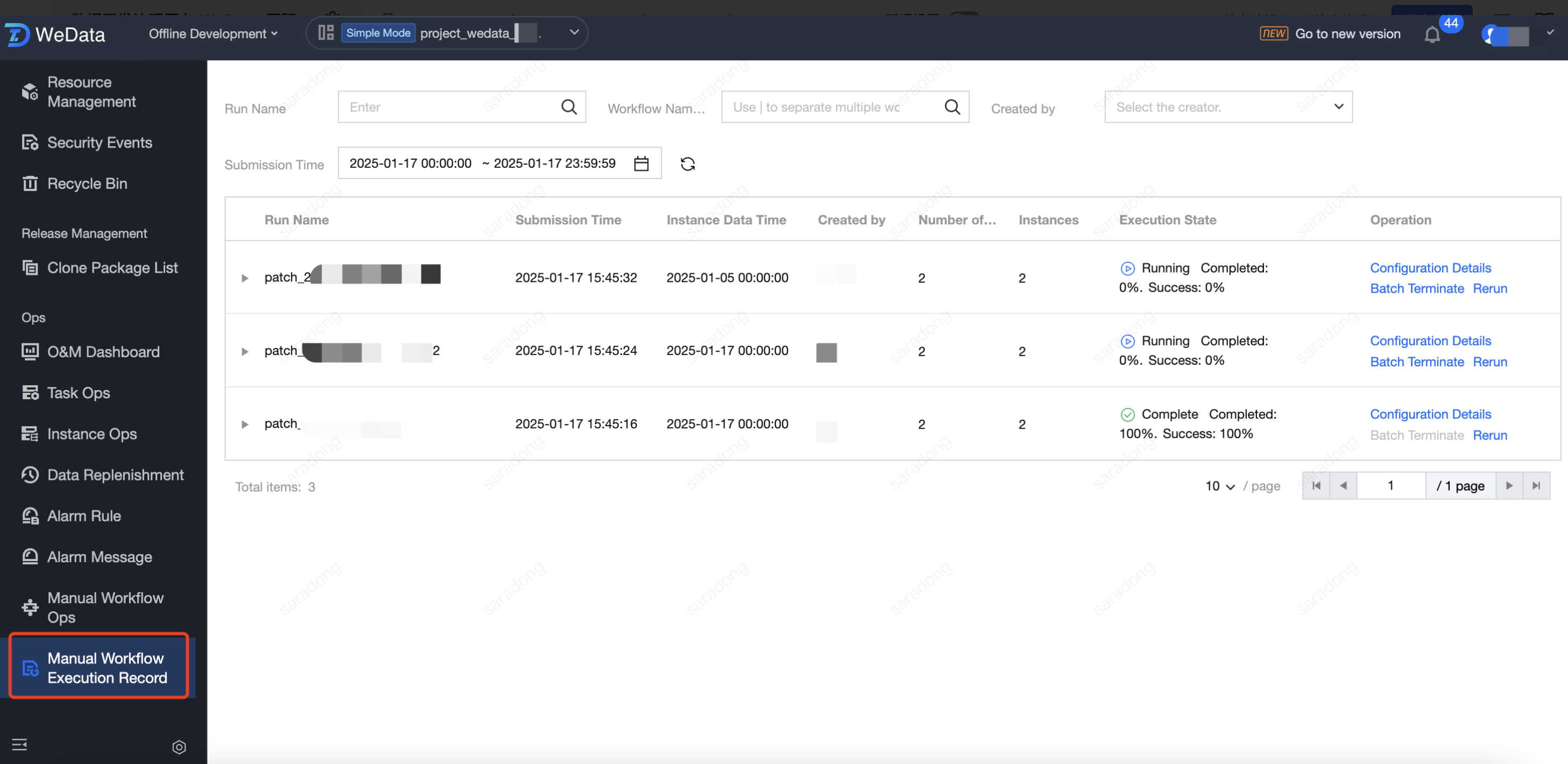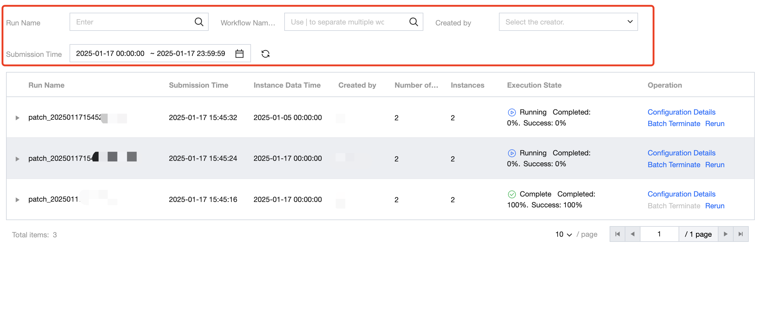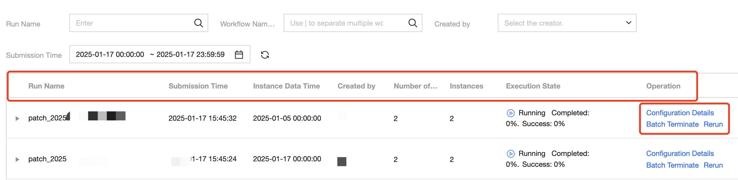 First-level List | The primary list is at the run level, displaying run-related information and operations. Information includes: run name, submission time, instance data time, creator, number of tasks, number of instances, execution status. Operations include: configuration details, terminate in batches, rerun. ![]() |