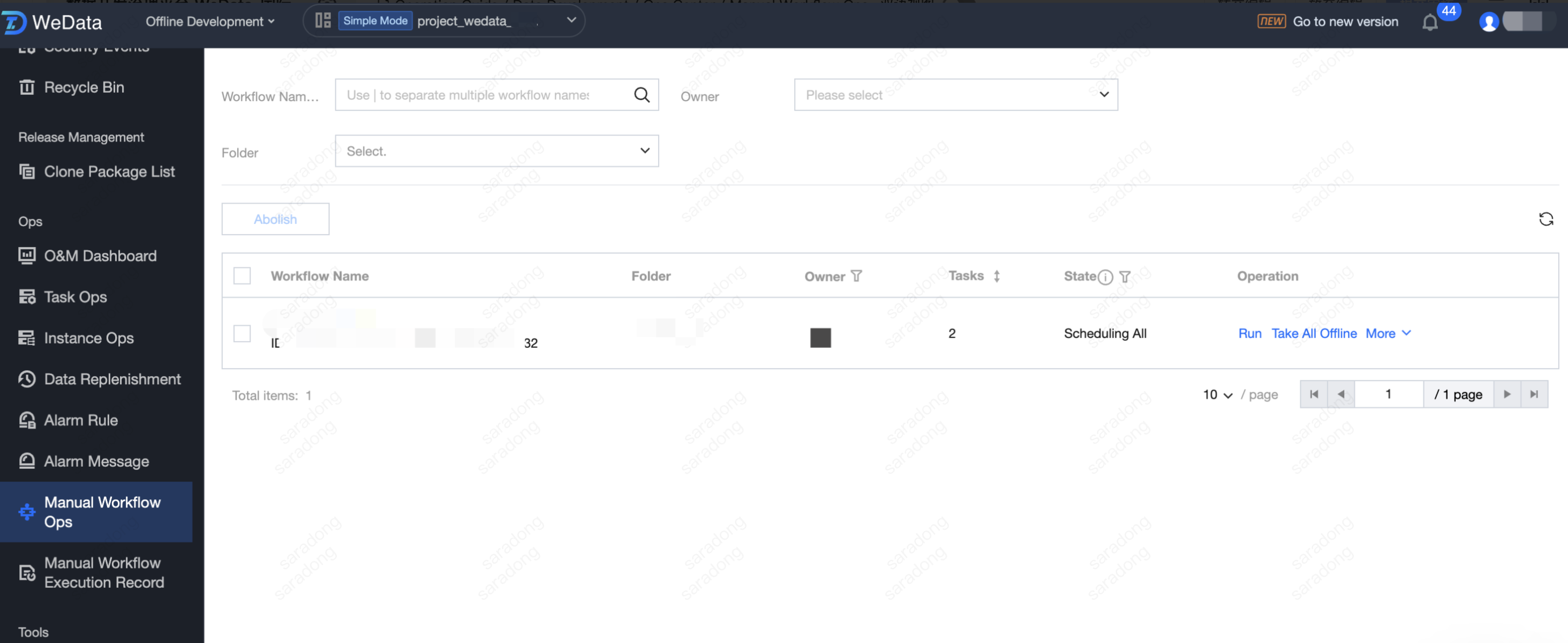 Delete Workflow | Deletes the workflow and all its tasks and instances. Only workflows with the status "All Offline" support the delete workflow operation. |