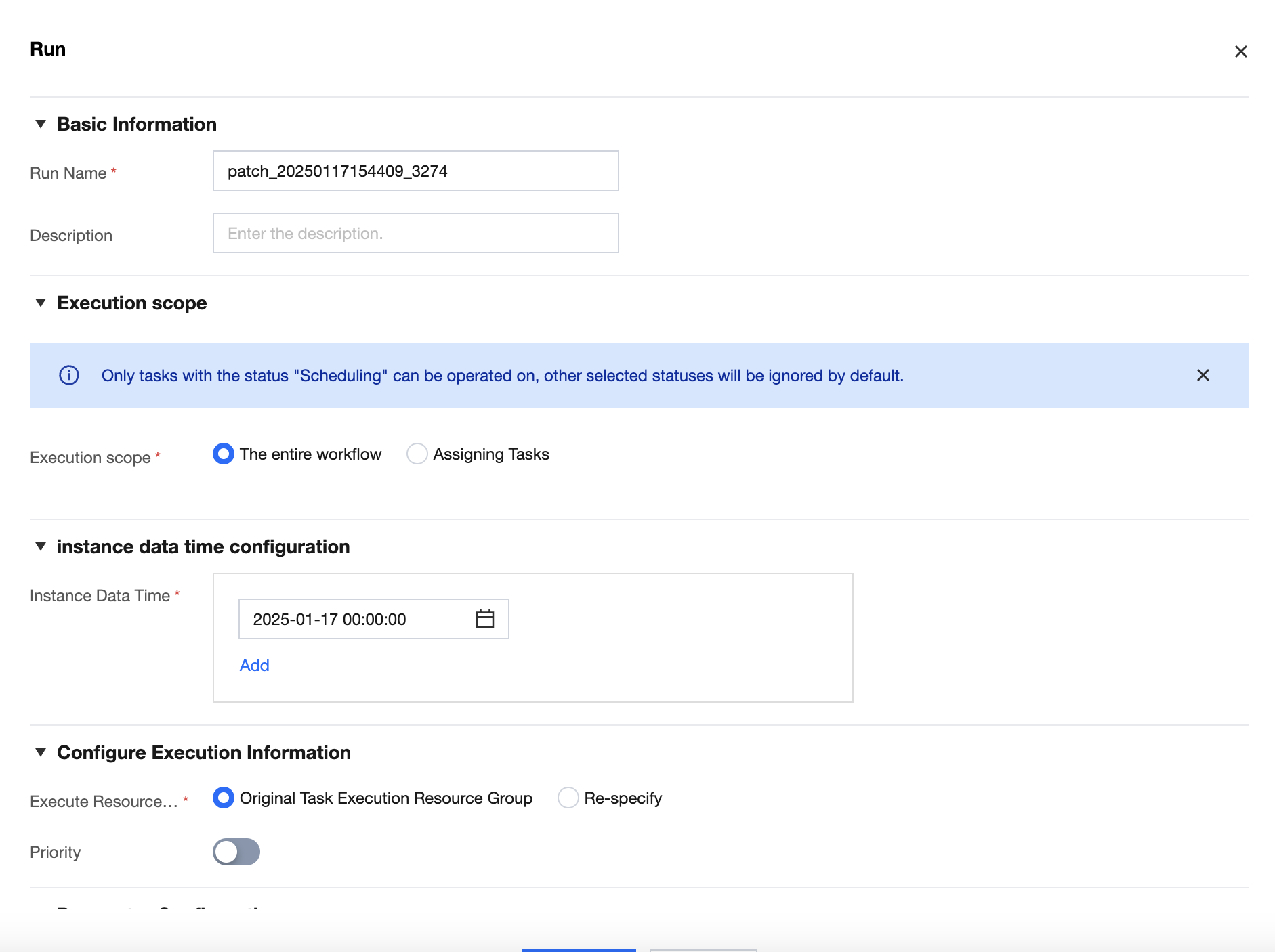 Running | Running means manually triggering the workflow. Only workflows with the status " Scheduling All" or "Scheduling Some" support the running operation. Workflows with the status "All offline" do not support the running operation. Click Run to open the pop-up and configure the run information. After configuration and successful submission, it indicates that the manual triggering is successful. Run Name and Description. Execution scope: You can specify that all tasks under the entire workflow run, or select some tasks under the workflow to run. Instance Data Time: The expected instance data time. Currently, it can be selected to the second level, and multiple instance data times can be configured for one run. Execute Resource Group: In case of resource constraints in the original resource group, you can switch to another resource group for execution. This configuration is only effective for this run. Priority: When data has a strict order requirement, you can choose to execute in instance data time order or reverse instance data time order. For example, a run submitted two instance data times: January 15, 2025, and January 16, 2025. If you choose to execute in instance data time order, the instance of January 15, 2025, will be executed first, followed by the instance of January 16, 2025. If you choose to execute in reverse instance data time order, the instance of January 16, 2025, will be executed first, followed by the instance of January 15, 2025. Custom Parameter: During each execution, different parameter values can be specified based on business requirements, allowing users to configure freely according to business scenarios. ![]() |